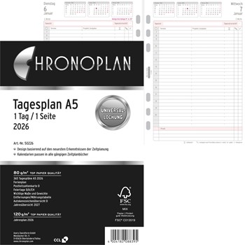 Mit dem CHRONOPLAN Tagesplan 2026 im A5 Format für Ihren Terminplaner behalten Sie die Übersicht über Ihre Termine und Aufgaben. Diese Kalendereinlage ermöglicht ein effizientes und übersichtliches Zeitmanagement mit einer Seite pro Tag. Durch den Zweifarbdruck wird die Zeitplanung übersichtlicher. Zudem ermöglicht Ihnen der Chronoplan Tagesplan das Notieren von Tageszielen, Priorisierung von Aufgaben und eine variable Zeiteinteilung bis 22 Uhr. Viele weitere Extras wie Jahresplan, Ferien- und Feiertagsübersicht, Postleitzahlenkarte u.v.m. machen den Chronoplan Terminplaner komplett.