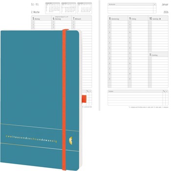 Kalender mit Softcover in Petrol mit goldfarbener Elementary Prägung