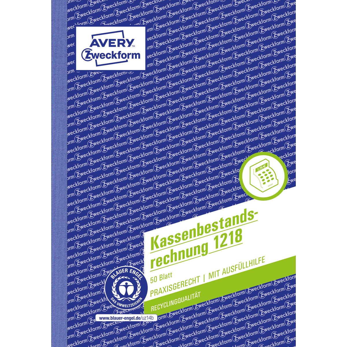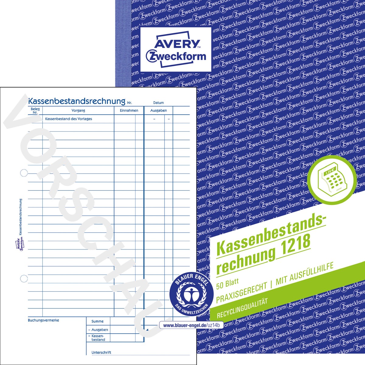 Die Recycling-Kassenbestandsrechnung 1218 von AVERY ZWECKFORM im DIN A5 Format hilft Ihnen bei der rechnerischen Ermittlung der Tageseinnahmen und Ausgaben und des Kassenbestands am Ende des Tages. Dies ermöglicht Ihnen die taggenaue Erfassung aller Zahlungsvorgänge. Die Kassenbestandsrechnung enthält 50 weiße mikroperforierte Originale zum einfachen Heraustrennen. Die Kassenbücher und Kassenberichte von Avery Zweckform sind zuverlässige, bewährte Hilfen für Ihre Buchhaltung und Steuer und werden regelmäßig von Rechtsexperten geprüft. Die nachhaltige und schadstoffarme Herstellung aus 100% recyceltem Altpapier wird durch die Zertifizierung mit dem Blauen Engel garantiert.