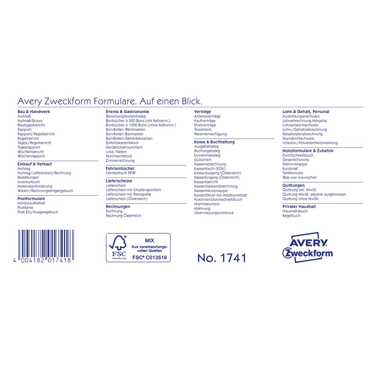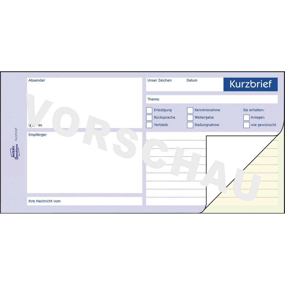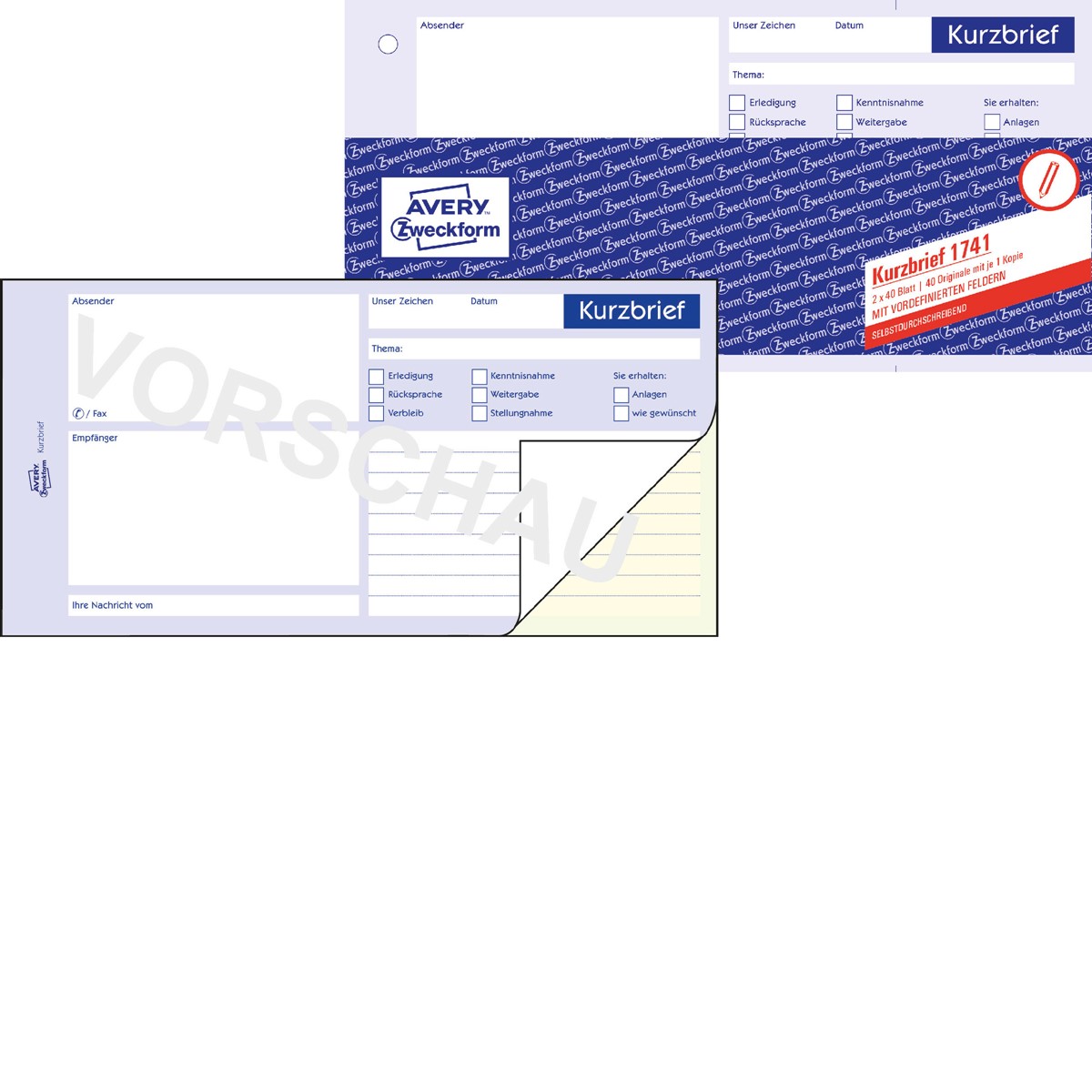 Der Kurzbrief 1741 von AVERY ZWECKFORM im 1/3 DIN A4 Format enthält bereits die wichtigsten Punkte zum Ankreuzen, z.B. zur Erledigung, Rücksprache, Stellungnahme, etc. Der links verleimte Abreißblock beinhaltet 40 weiße Kurzbrief Vorlagen mit jeweils einem bedruckten, selbstdurchschreibenden Durchschlag in gelb. Die Notizformulare und Kurzbriefe von Avery Zweckform sind praktische, bewährte Hilfen für Ihre Kommunikation und Notizen im Büro und zu Hause.
