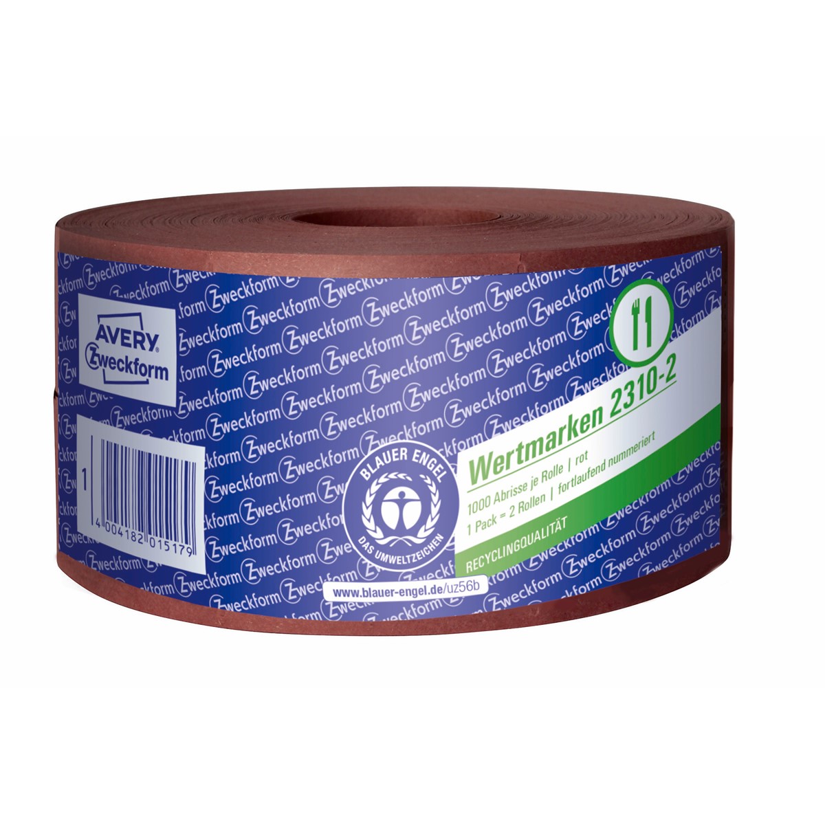 Die Wertmarken 2310-2 von AVERY ZWECKFORM im Format 57x30 mm sind die ideale Organisationshilfe für jegliche Art von Veranstaltung. Die Rolle enthält 1000 fortlaufend nummerierte rote Bons. Dank der Wertmarken von Avery Zweckform können Sie den Umgang mit Bargeld vermeiden. Die Formulare und Vordrucke von Avery Zweckform sind zuverlässige, bewährte Hilfen für Veranstaltungen und Events.