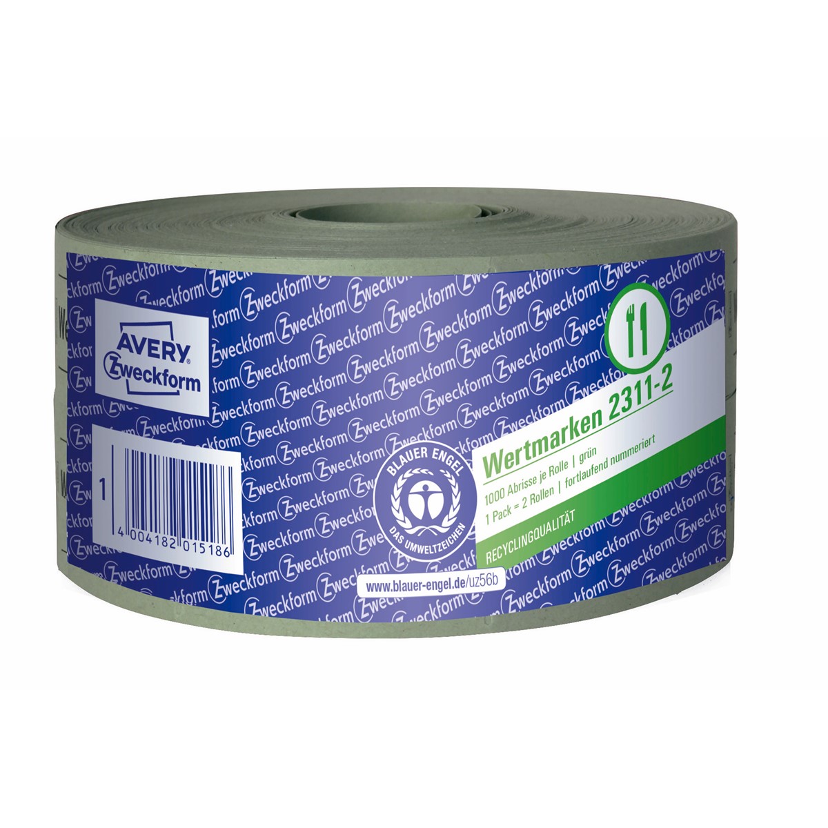 Die Wertmarken 2311-2 von AVERY ZWECKFORM im Format 57x30 mm sind die ideale Organisationshilfe für jegliche Art von Veranstaltung. Die Rolle enthält 1000 fortlaufend nummerierte grüne Bons. Dank der Wertmarken von Avery Zweckform können Sie den Umgang mit Bargeld vermeiden. Die Formulare und Vordrucke von Avery Zweckform sind zuverlässige, bewährte Hilfen für Veranstaltungen und Events.