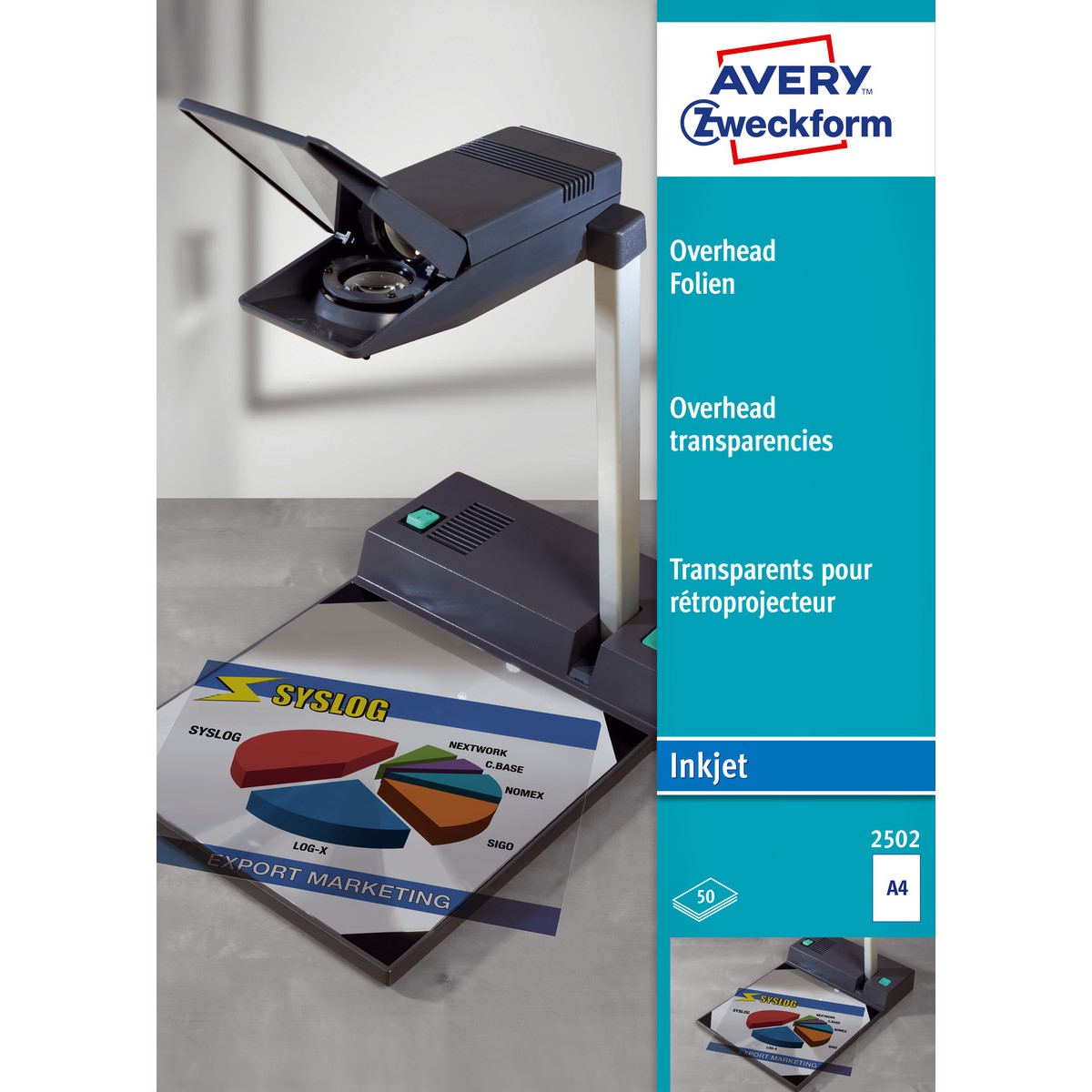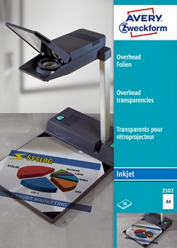 Mit den klaren, beschichteten Overhead-Folien 2502 für Inkjetdrucker von AVERY ZWECKFORM im DIN A4 Format können Sie hochwertige Präsentationen für die nächste Besprechung oder Unterrichtsstunde erstellen. 50 Overheadfolien pro Packung. Die A4 Overheadfolie mit einer Folienstärke von 0,11 mm sorgt dank Inkjet-Spezialbeschichtung für eine brillante Farbwiedergabe und konturenscharfen Farbpunktverlauf. Die schnelle Farbaufnahme verhindert Verschmieren und Verlaufen der Tinte. Die Overheadfolie ist stapelverarbeitbar und lösemittelfrei. Gestalten und drucken Sie Ihre Overheadfolien von Avery Zweckform einfach und schnell am PC mit Ihren Texten und Bildern. Für alle gängigen Inkjetdrucker geeignet.