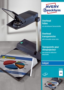 Mit den klaren, beschichteten Overhead-Folien 2504 für Inkjetdrucker von AVERY ZWECKFORM im DIN A4 Format können Sie hochwertige Präsentationen für die nächste Besprechung oder Unterrichtsstunde erstellen. 50 Overheadfolien pro Packung. Die A4 Overheadfolie mit einer Folienstärke von 0,11 mm sorgt dank Inkjet-Spezialbeschichtung für eine brillante Farbwiedergabe und konturenscharfen Farbpunktverlauf. Die schnelle Farbaufnahme verhindert Verschmieren und Verlaufen der Tinte. Die Overheadfolie ist mit einem Sensorstreifen an der kurzen Seite versehen und zudem stapelverarbeitbar und lösemittelfrei. Gestalten und drucken Sie Ihre Overheadfolien von Avery Zweckform einfach und schnell am PC mit Ihren Texten und Bildern. Für alle gängigen Inkjetdrucker geeignet.
