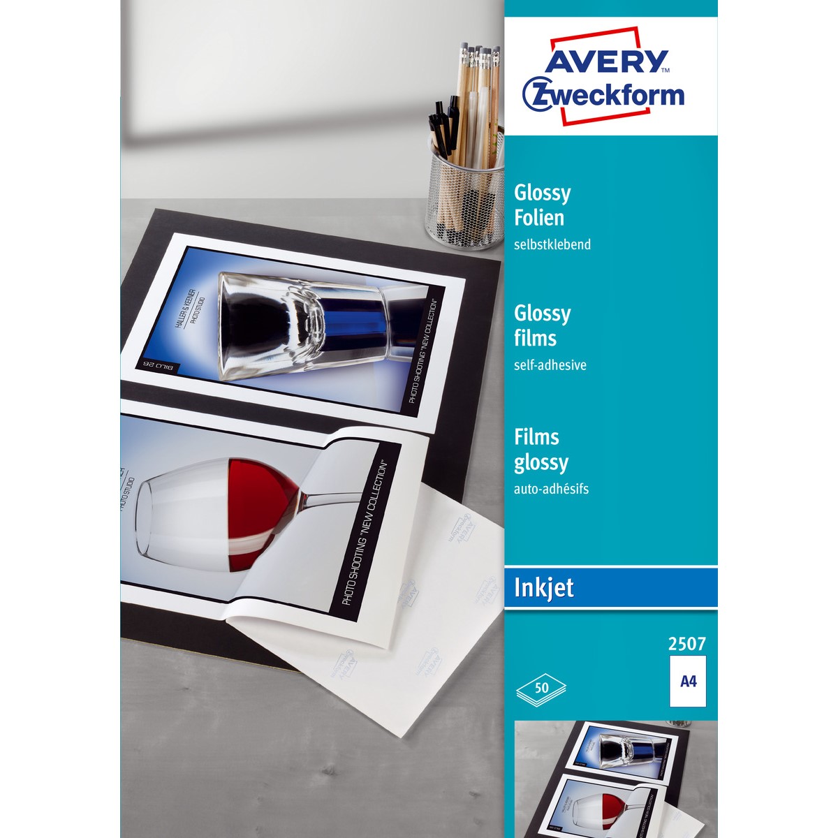 Die weissen, selbstklebenden Glossy-Folien 2501 für Inkjetdrucker von AVERY ZWECKFORM im DIN A4 Format eignen sich ideal für den Ausdruck von Fotos und Bildern. 50 Klebefolien pro Packung. Die selbstklebende Folie, mit einer Stärke von 0,2 mm sorgt dank hochglänzender Inkjetbeschichtung für fotorealistische, gestochen scharfe Ausdrucke. Die Klebefolie ist zudem stapelverarbeitbar und lösemittelfrei. Gestalten und drucken Sie Ihre Klebefolien von Avery Zweckform einfach und schnell am PC mit Ihren Texten und Bildern. Für alle gängigen Inkjetdrucker geeignet.