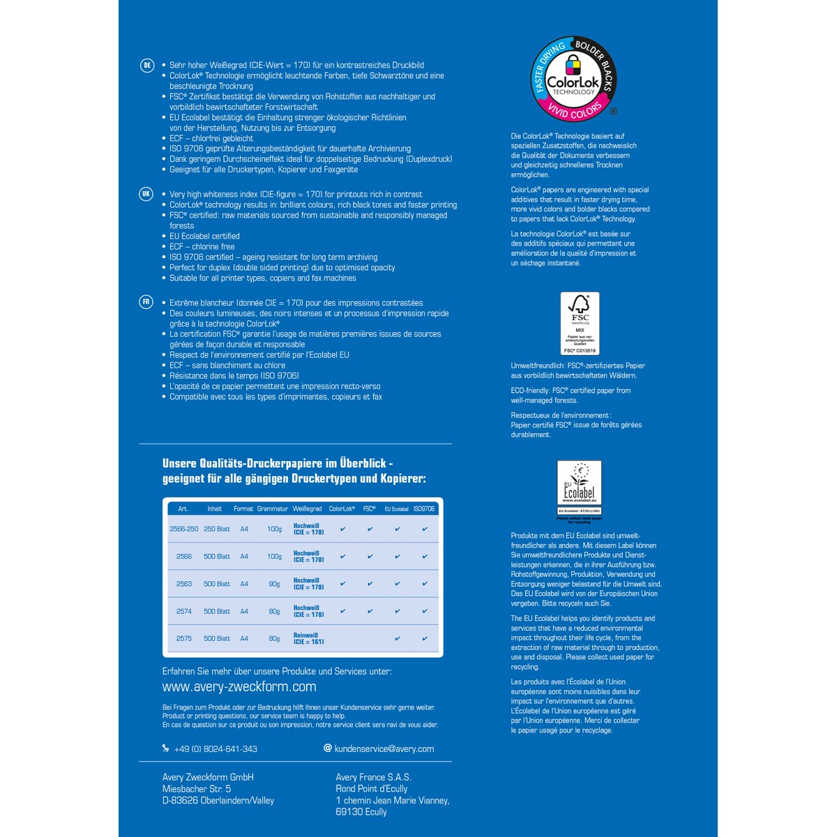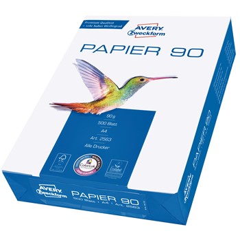 Das blickdichte Drucker-und Kopierpapier 2563 von AVERY ZWECKFORM im DIN A4 Format ist ideal für den täglichen Gebrauch im Büro oder zu Hause. 500 Blatt Druckerpapier pro Packung. Das Druckerpapier von Avery Zweckform bietet eine hochwertige Papierqualität mit hohem Weißegrad für einen reibungslosen Druckerdurchlauf und zuverlässig gute Druckergebnisse. Das Kopierpapier mit einer Grammatur von 90 g eignet sich ideal für den Druck von z.B. E-Mailkorrespondenzen auf allen gängigen Druckertypen. Kopien von Gesprächsnotizen, Protokolle und Dokumenten sind schnell erstellt. Die integrierte ColorLok® Technologie basiert auf speziellen Zusatzstoffen, die nachweislich die Qualität beim Druck des Papieres verbessern und gleichzeitig eine schnellere Trocknung ermöglichen. FSC®-zertifiziert mit Papier aus vorbildlich bewirtschafteten Wäldern. EU Ecolabel zertifiziert - EU Ecolabel Produkte sind umweltfreundlicher als andere. Das Ecolabel wird von der EU vergeben.