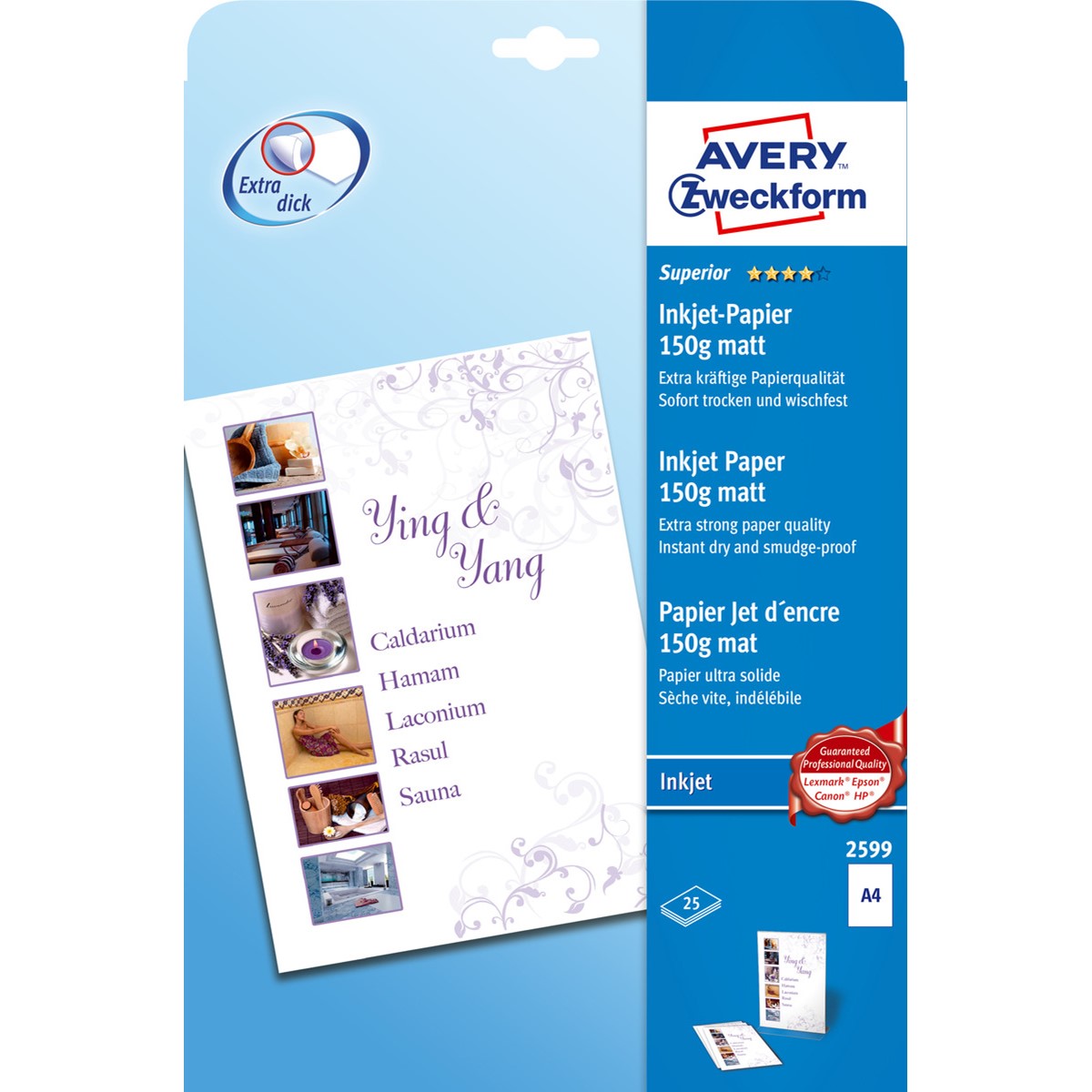 Mit dem Superior Inkjet Papier matt 2599 von AVERY ZWECKFORM im DIN A4 Format erreichen Sie besonders hochwertige Druckergebnisse. 25 Blatt Papier pro Packung. Die matte Spezialbeschichtung des Papieres sorgt für eine sehr gute Farbwiedergabe und kontrastreiche Ausdrucke. Das Inkjet Druckerpapier mit extra kräftiger Papierqualität von 150 g ist nach dem Druck sofort trocken & wischfest dank effektiver Trockenformel. Das Inkjet Papier von Avery Zweckform eignet sich ideal für den Druck von professionellen Verkaufsunterlagen und Broschüren mit hohem Bild- und Textanteil. FSC®-zertifiziert mit Papier aus vorbildlich bewirtschafteten Wäldern.