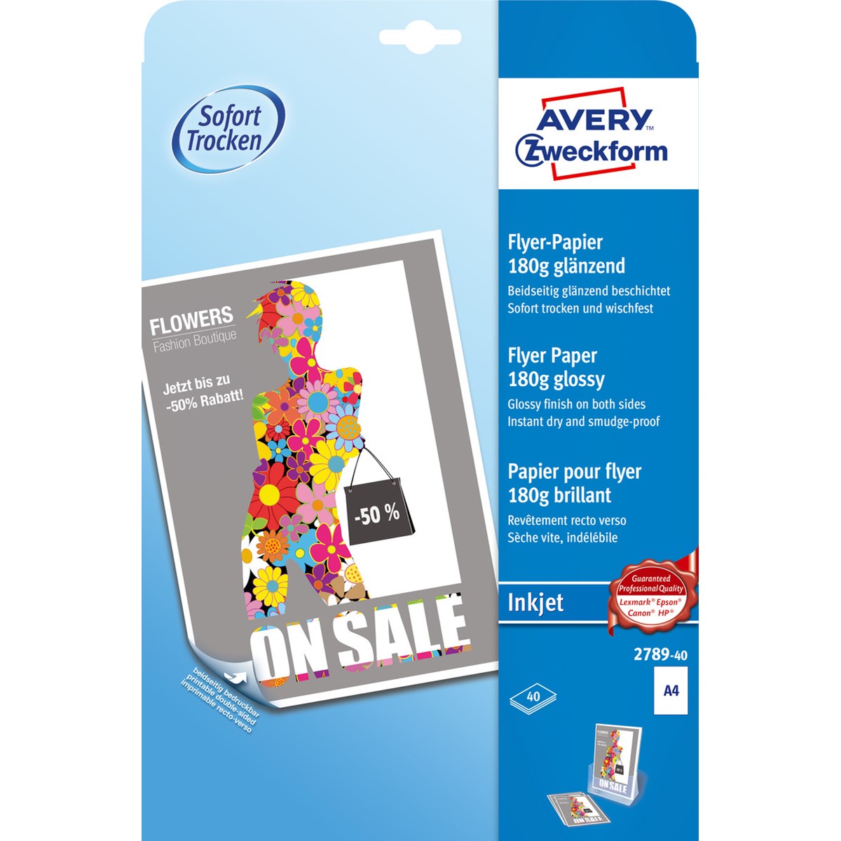 Mit dem Flyer-Papier 2789-40 von AVERY ZWECKFORM im DIN A4 Format können Sie eigene Flyer für professionelle Verkaufsunterlagen in kleiner Auflage selber gestalten und erstellen. 40 Blatt Papier pro Packung. Das Flyer-Papier ist beidseitig glänzend beschichtet für eine hochwertige Optik und schnelle Trocknung. Das Druckerpapier mit mittleren Grammatur von 180 g ist stabil und blickdicht - optimal für beidseitig bedruckte Flyer. FSC®-zertifiziert mit Papier aus vorbildlich bewirtschafteten Wäldern. Flyer-Papier für alle gängigen Inkjet-Drucker geeignet.