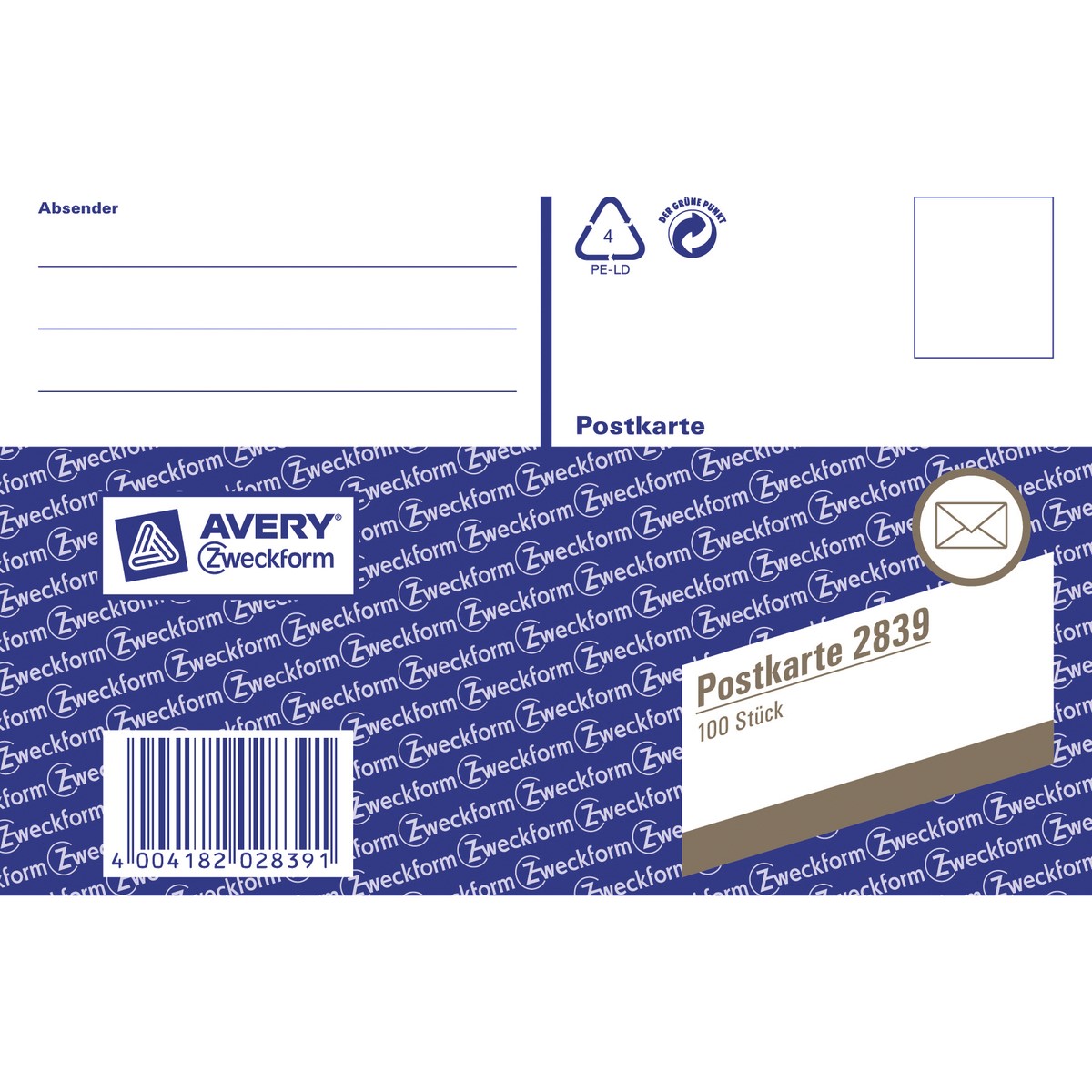Die Postkarte 2839 von AVERY ZWECKFORM im DIN A6 Querformat enthält ein Feld für Adresse und Absender sowie einen Raum für individuelle Vermerke. Die 100 losen blanko Postkarten sind immer schnell zur Hand und können sehr individuell gestaltet werden. Die Postkarten von Avery Zweckform sind zuverlässige, bewährte Hilfen für das Büro und zu Hause.