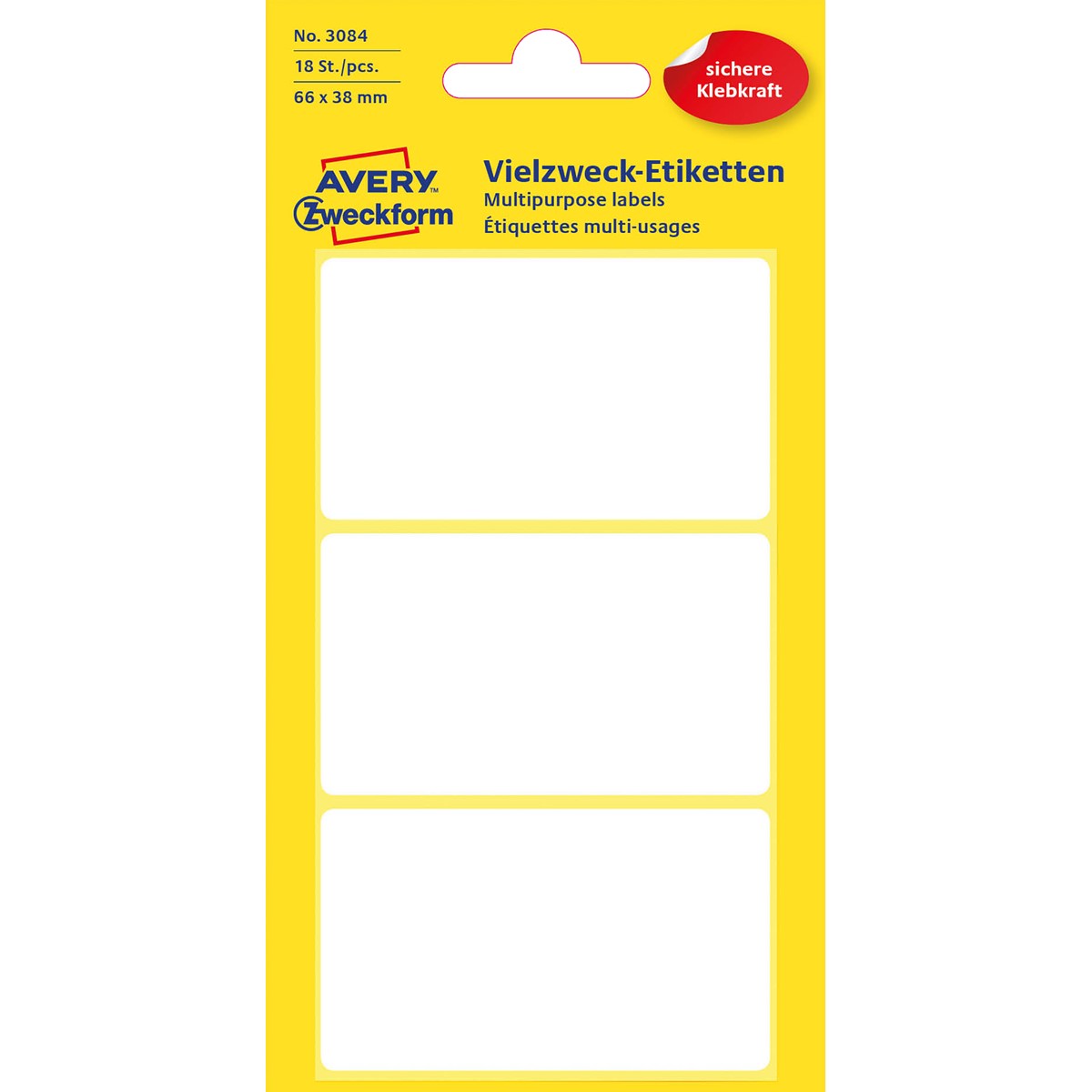 Die weißen, permanent haftenden Universal-Etiketten 3084 (66x38mm) zur Handbeschriftung von AVERY ZWECKFORM eignen sich z.B. besonders gut zur Beschriftung von Akten (18 Etiketten/Packung). Die Vielzweck-Aufkleber sind ideal für den schnellen und einfachen Gebrauch, um kostensparend Ordnung im Büro oder auch zu Hause zu schaffen - ohne Drucker, einfach mit einem Stift beschriften! Chlorfrei gebleicht.