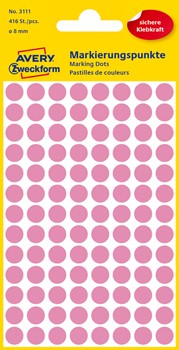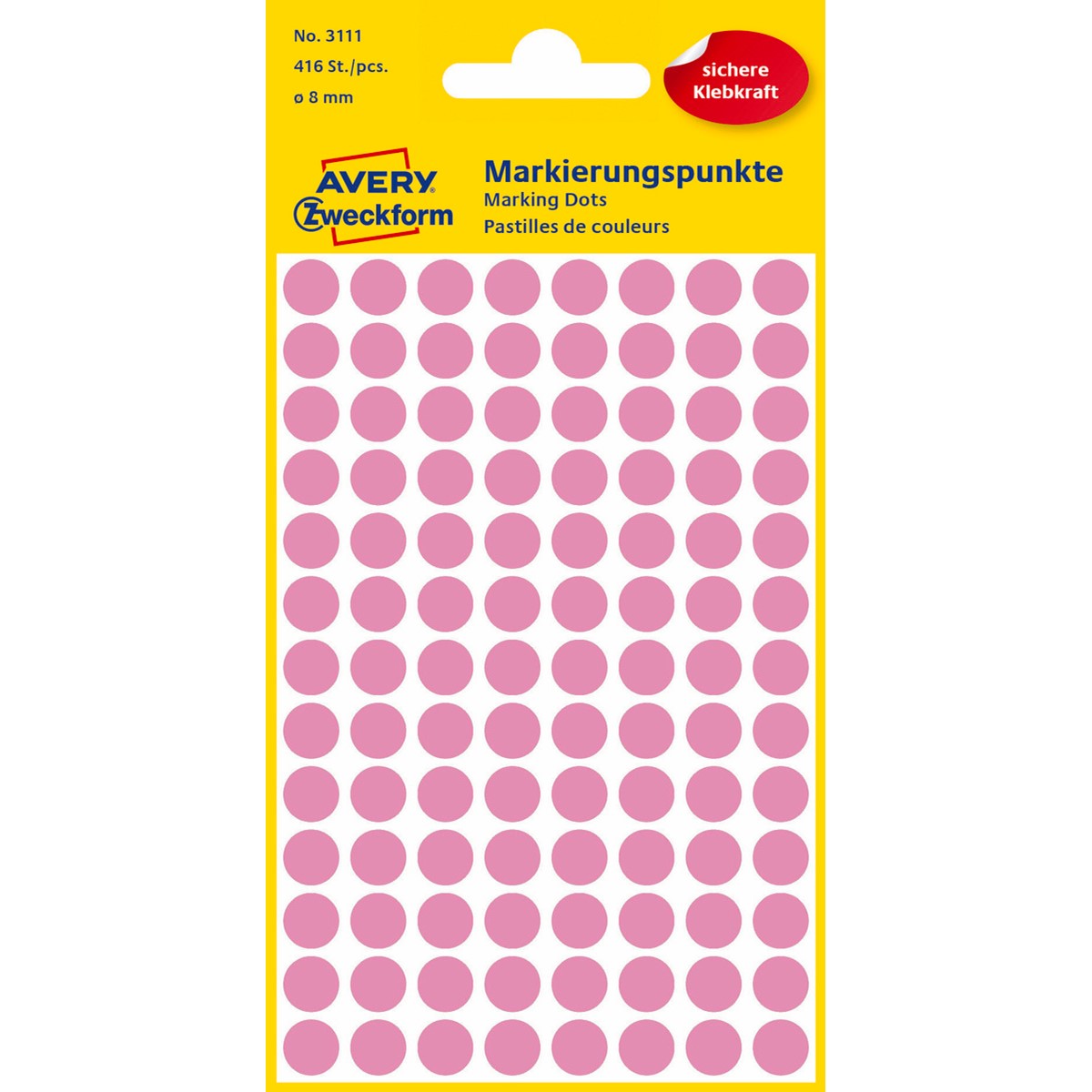 Die rosé farbenen, selbstklebenden Markierungspunkte 3111 mit einem Durchmesser von 8 mm von AVERY ZWECKFORM sind ideal zum Kennzeichnen, Ordnen, Organisieren, Terminieren und Planen. 416 runde Klebepunkte auf Bogen pro Packung.