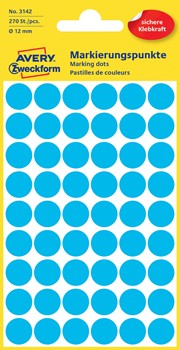 Die blauen, selbstklebenden Markierungspunkte 3142 mit einem Durchmesser von 12 mm von AVERY ZWECKFORM sind ideal zum Kennzeichnen, Ordnen, Organisieren, Terminieren und Planen. 270 runde Klebepunkte auf Bogen pro Packung.