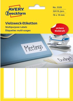 Die weißen, permanent haftenden Universal-Etiketten 3328 (76x19mm) zur Handbeschriftung von AVERY ZWECKFORM eignen sich z.B. besonders gut zur Beschriftung von Ablagefächern (324 Etiketten/Packung). Die Vielzweck-Aufkleber sind ideal für den schnellen und einfachen Gebrauch, um kostensparend Ordnung im Büro oder auch zu Hause zu schaffen - ohne Drucker, einfach mit einem Stift beschriften! Chlorfrei gebleicht.