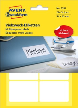 Die weißen, permanent haftenden Universal-Etiketten 3337 (54x35mm) zur Handbeschriftung von AVERY ZWECKFORM eignen sich z.B. besonders gut zur Beschriftung von Mappen (224 Etiketten/Packung). Die Vielzweck-Aufkleber sind ideal für den schnellen und einfachen Gebrauch, um kostensparend Ordnung im Büro oder auch zu Hause zu schaffen - ohne Drucker, einfach mit einem Stift beschriften! Chlorfrei gebleicht.