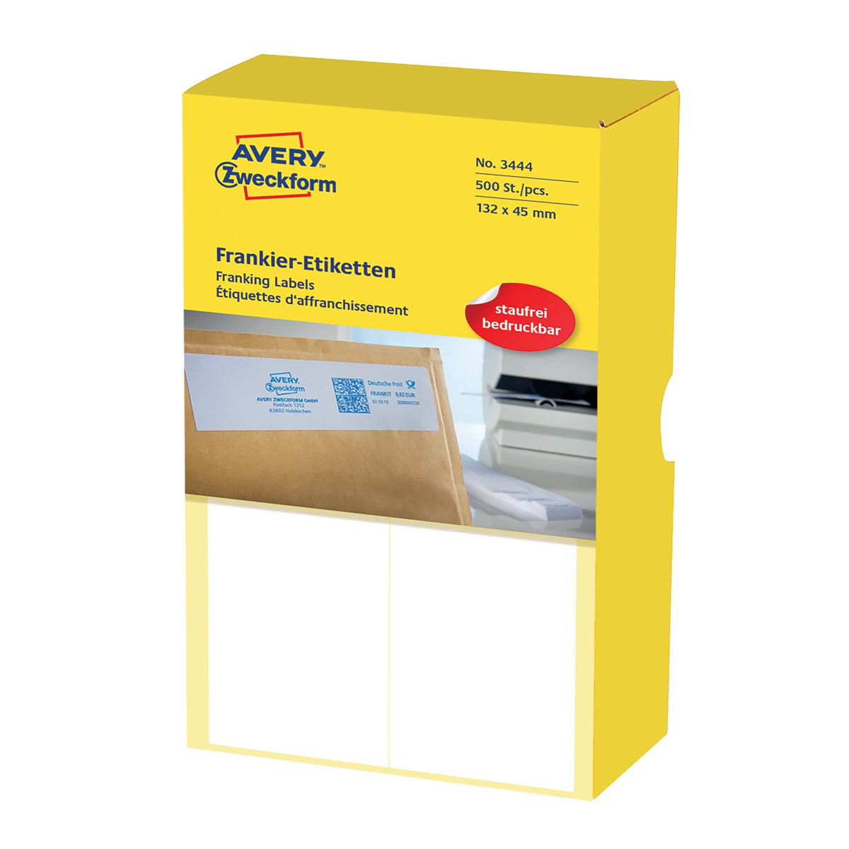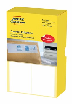Die weißen Frankier-Etiketten 3444 (132x45mm) von AVERY ZWECKFORM eignen sich unter anderem für Frankiermaschinen von Francotyp-Postalia(Optimail, optimail 30, T1000). 500 Doppel-Etiketten pro Packung. Sie können sich auf einen absolut staufreien Durchlauf mit einem klaren und sofort wischfestem Druckbild dank saugfähigem Spezialpapier verlassen. Gestalten und drucken Sie Ihre Frankieretiketten schnell und einfach mit Frankiermaschinen. Passend zu indirekten Freistempeln von dickeren Briefen, Päckchen und Paketen. Für zusätzliche Werbeklischees geeignet.
