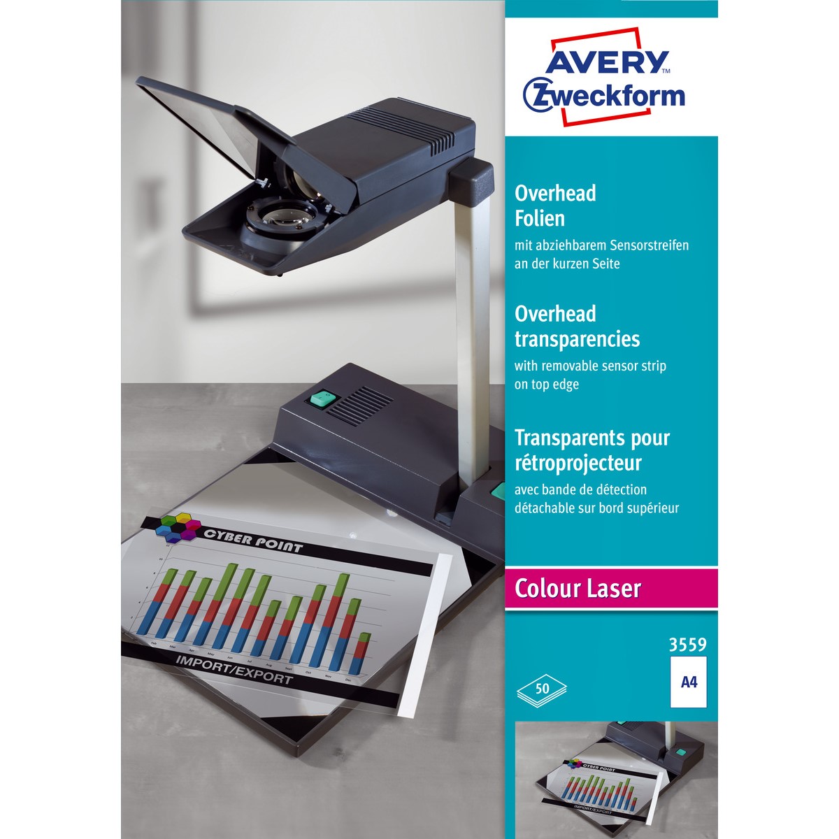 Mit den Overhead-Folien für Farblaserdrucker 3559 von AVERY ZWECKFORM im DIN A4 Format können Sie professionelle Präsentationen für Referate, Besprechungen oder Schulungen erstellen. 50 Overheadfolien pro Packung. Die A4 Overheadfolie, mit einer Folienstärke von 0,10 mm sorgt dank Spezialbeschichtung für konturenscharfe Ausdrucke und beste Tonerhaftung. Die Overheadfolie mit abziehbarem Sensorstreifen an kurzer Seite ist stapelverarbeitbar und lösemittelfrei. Gestalten und drucken Sie Ihre Overheadfolien von Avery Zweckform einfach und schnell am PC mit Ihren Texten und Bildern. Für alle gängigen Laserdrucker geeignet.