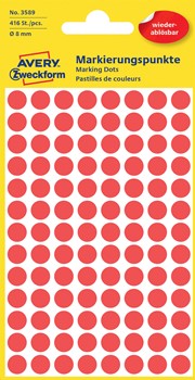 Die roten, selbstklebenden, wiederablösbaren Markierungspunkte 3589 mit einem Durchmesser von 8 mm von AVERY ZWECKFORM sind ideal zum Kennzeichnen, Ordnen, Organisieren, Terminieren und Planen. 416 runde Klebepunkte auf Bogen pro Packung.