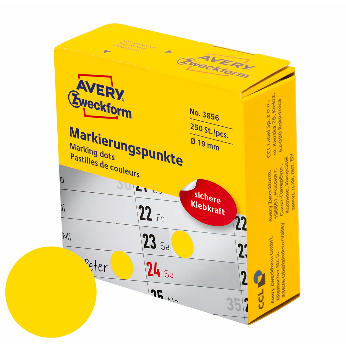Die gelben, selbstklebenden Markierungspunkte 3856 mit einem Durchmesser von 19 mm von AVERY ZWECKFORM AVERY ZWECKFORM werden in einem handlichen Spender angeboten. Sie sind ideal zum Kennzeichnen, Ordnen, Organisieren, Terminieren und Planen. 250 runde Klebepunkte auf Rolle pro Spenderpackung. Durch den Spender können die Etiketten sehr einfach entnommen werden, sie sind gleichzeitig aber auch sauber und stabil aufbewahrt.