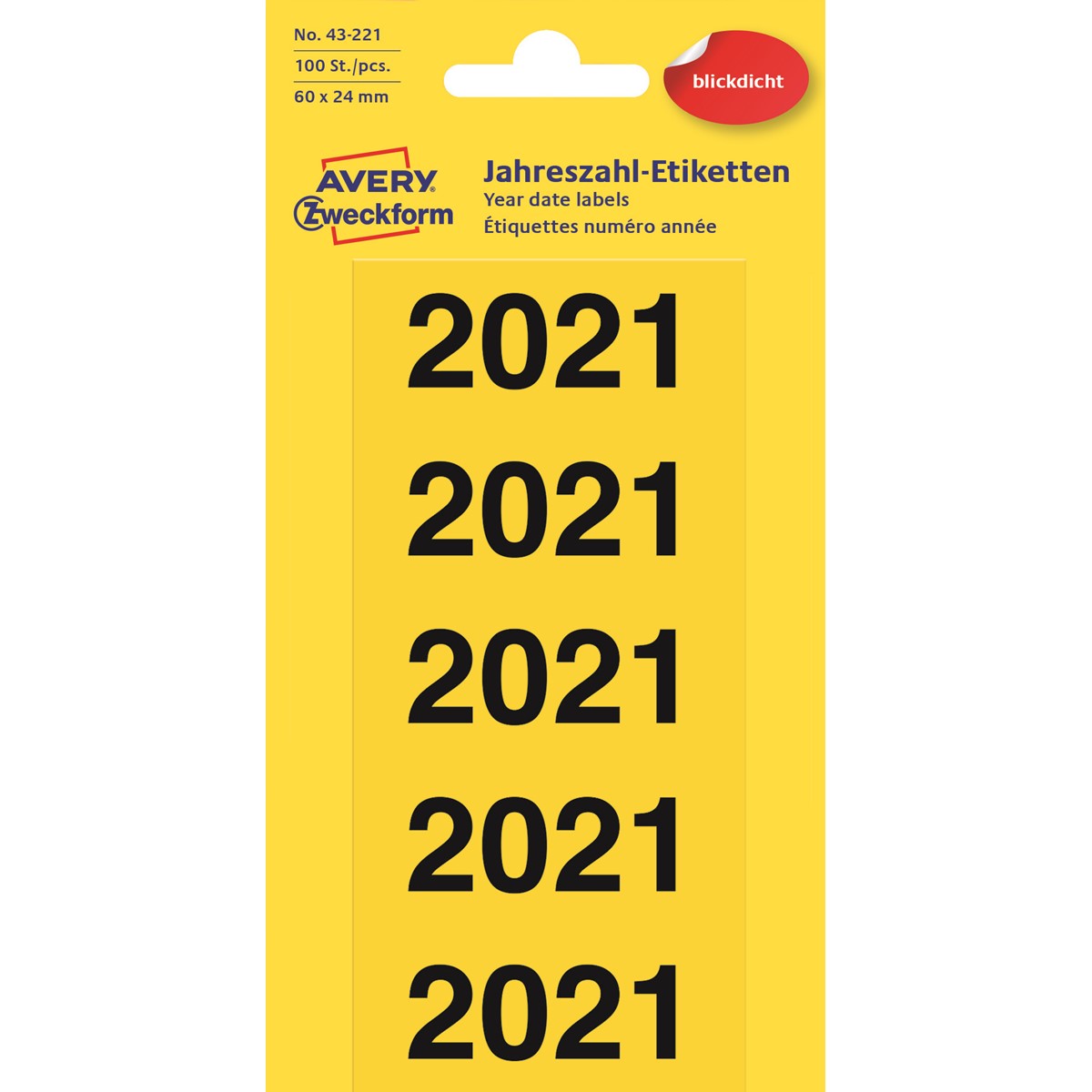Die gelben, selbstklebenden Jahreszahl-Etiketten 43-221 im Format 60x24mm von AVERY ZWECKFORM eignen sich optimal zur übersichtlichen Organisation Ihrer Akten nach Jahren dank der vorgedruckten Jahreszahl 2021. 100 vorgedruckte Etiketten pro Packung. Die Ordneretiketten mit vorgedruckten Jahreszahlen sind besonders blickdicht und decken so alte Beschriftungen und Etiketten zuverlässig und sauber ab.