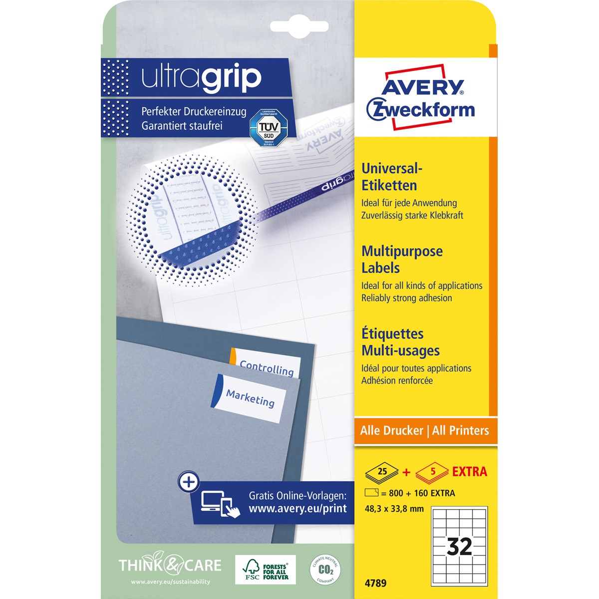 Qualität vom Etiketten-Experten: Die weißen Universal-Etiketten 4789 im Format 48,3 x 33,8 mm von Avery Zweckform haften mit starker permanenter Klebkraft absolut zuverlässig auf Papier, Karton, Glas und vielen gängigen Kunststoffen. Die Aufkleber (800 Etiketten/Pack + 160 Etiketten EXTRA) sind die Premium-Lösung zur Beschriftung von Unterlagen, Dokumenten und vielem mehr in Office und Home Office oder auch privat.