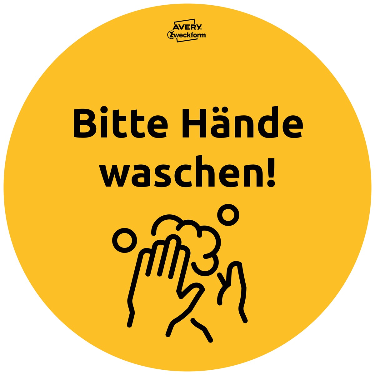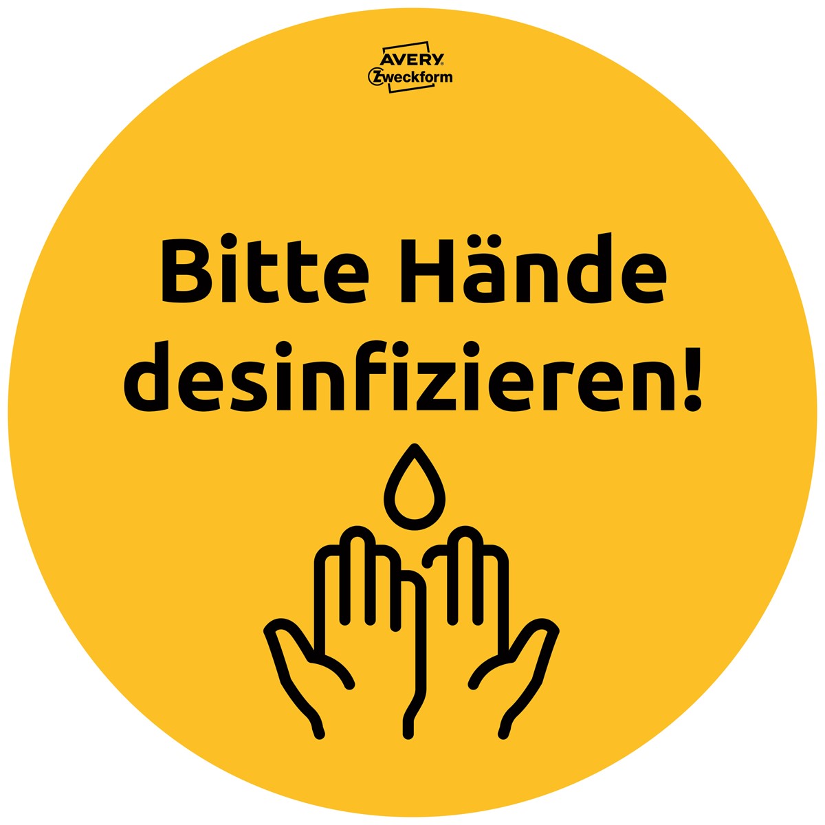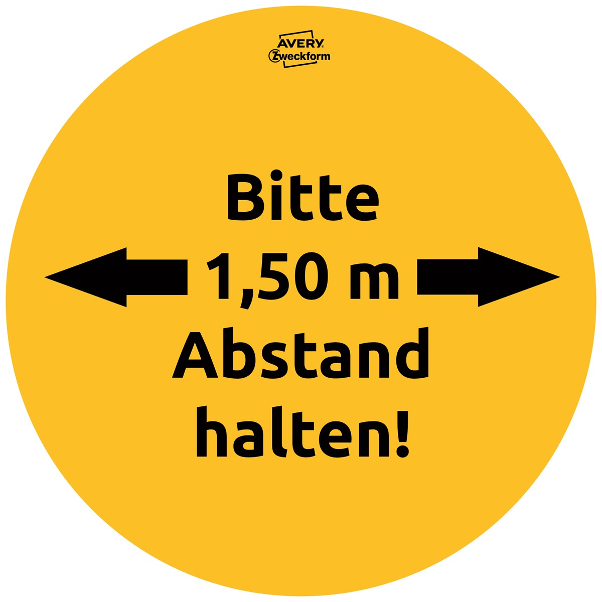 Die strapazierfähigen, selbstklebenden und wasserfesten Folien-Etiketten von AVERY ZWECKFORM sind optimal für die Innen- und Außenanwendung geeignet. Mit dem Durchmesser von 20cm und der Farbgebung gelb/schwarz ist maximale Sichtbarkeit gegeben. Aktuelle Abstands- und Hygieneregeln sind leicht verständlich in Bild und Text dargestellt.