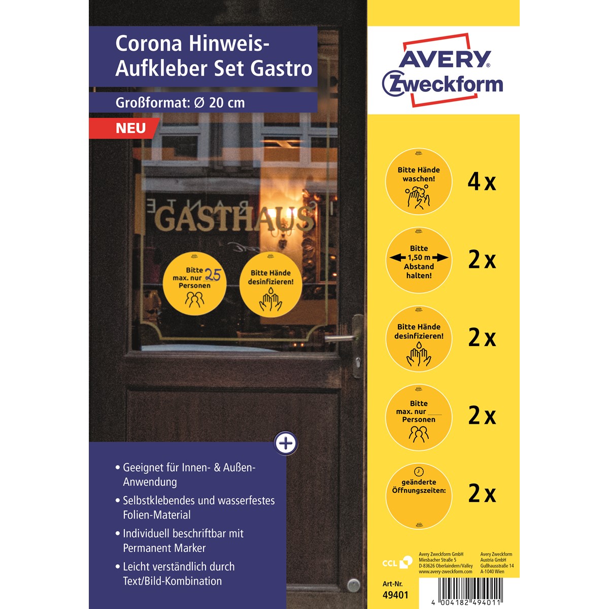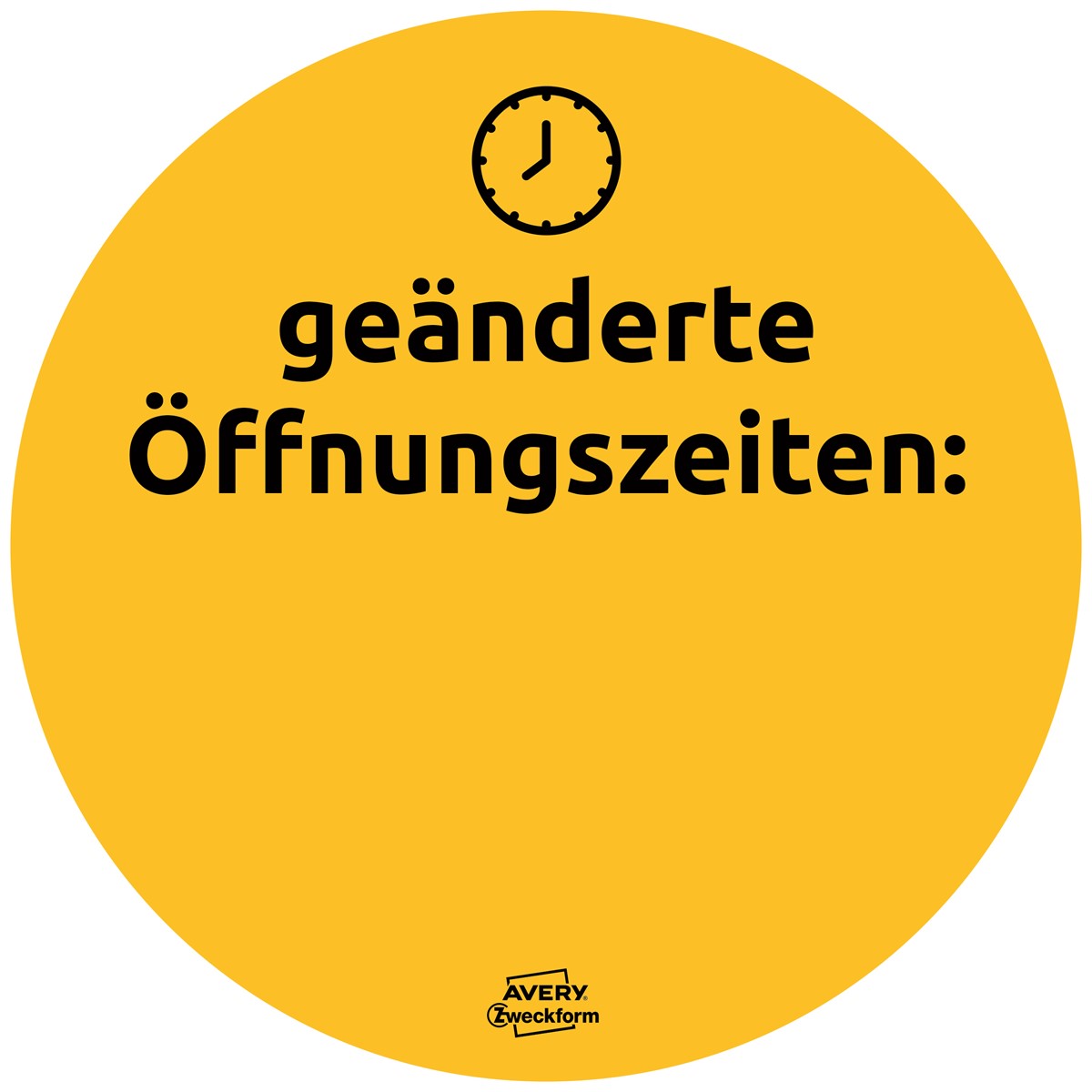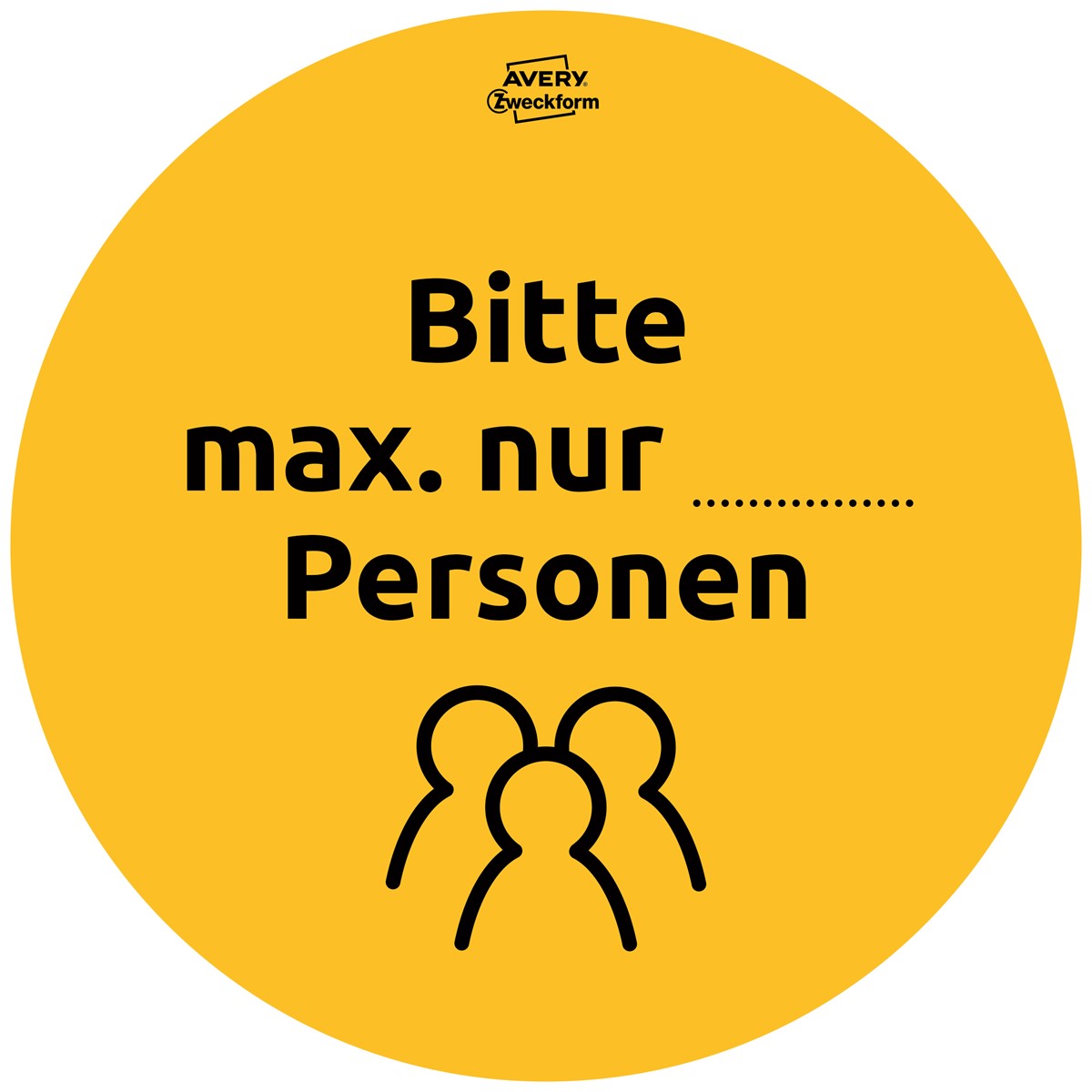 Die strapazierfähigen, selbstklebenden und wasserfesten Folien-Etiketten von AVERY ZWECKFORM sind optimal für die Innen- und Außenanwendung geeignet. Mit dem Durchmesser von 20cm und der Farbgebung gelb/schwarz ist maximale Sichtbarkeit gegeben. Aktuelle Abstands- und Hygieneregeln sind leicht verständlich in Bild und Text dargestellt.