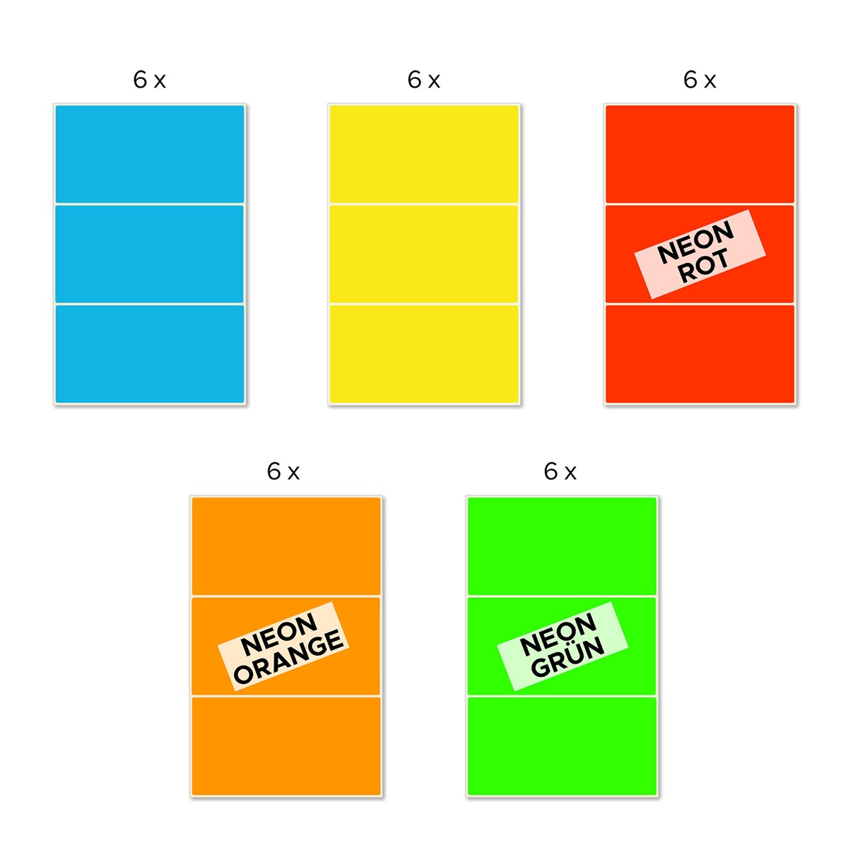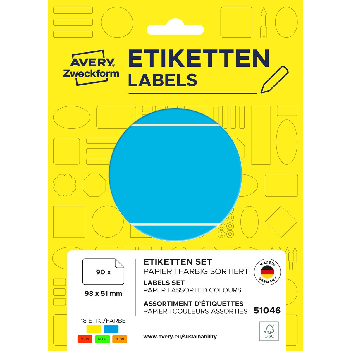 Qualität vom Etiketten-Experten: Die bunt sortierten, permanent haftenden Etiketten 51046 zur Handbeschriftung im Format 98 x 51 mm von AVERY ZWECKFORM eignen sich perfekt zur auffälligen Kennzeichnung in Büro und Haushalt. 90 Etiketten auf 30 Bogen pro Packung. Die praktische Flachpackung aus Karton mit einem recycelten Anteil von 90% ist einfach wiederverschließbar für eine handliche und saubere Aufbewahrung der Etiketten. Praktisch in Büro und Haushalt: die kleinen Etiketten sind perfekt für die farbkoordinierte Organisation und Beschriftung von Unterlagen, Dokumenten, Ablage, Kisten und Behältern und zur Beschriftung im Haushalt. Die bunten Etiketten eignen sich auch perfekt als Umzugsaufkleber zur besseren Organisation bei Umzügen. Jede Packung enthält Etiketten in den 5 Farben Blau, Gelb, Neongrün, Neonorange und Neonrot.