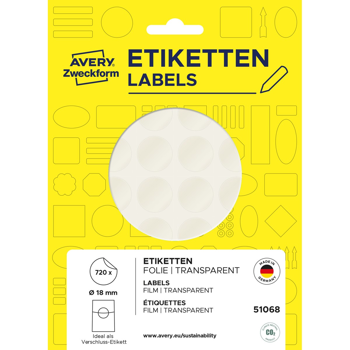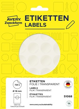 Die transparenten, permanent haftenden Verschluss-Etiketten 51068 im runden Format mit einem Durchmesser von 18 mm von AVERY ZWECKFORM eignen sich perfekt zum Verschliessen oder einfachem Versiegeln von Produkt- und Versandpackungen oder als stylischer Ersatz bei Geschenkverpackungen. Ideal zum privaten Gebrauch, für Selbstvermarkter und im Einzelhandel. 720 Etiketten auf 15 Bogen pro Packung. Die praktische Flachpackung aus Karton mit einem recycelten Anteil von 90% ist einfach wiederverschließbar für eine handliche und saubere Aufbewahrung der Etiketten.
