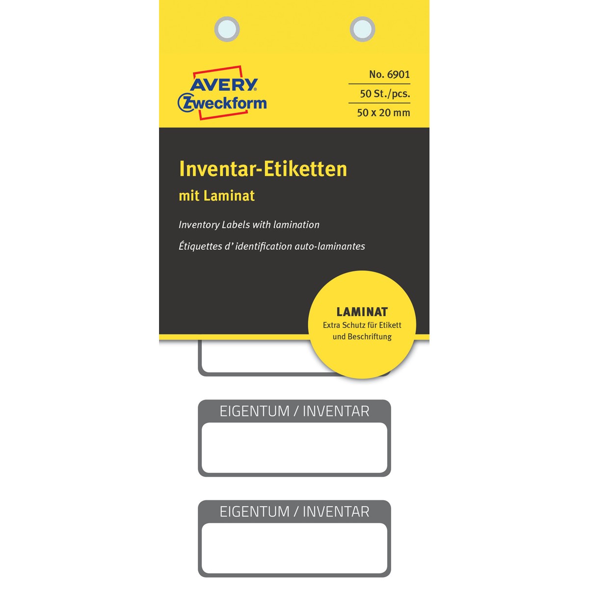 Die schwarzen, selbstklebenden Inventar-Etiketten 6901 im Format 50x20mm von AVERY ZWECKFORM schützen die Beschriftung besonders durch das anhängende, transparente Polyester-Laminat. 50 Inventaretiketten auf 10 Bogen im praktischen Spenderheft. Die Etiketten sind besonders strapazierfähig und können ganz einfach mittels Folienstift oder Kugelschreiber individuell vor Ort beschriftet werden. Durch das Laminat sind Etikett und Beschriftung besonders geschützt. Einfach Etikett beschriften, Trägerfolie vom Laminat abziehen und aufkleben. Die Etiketten sind ideal zur dauerhaften Kennzeichnung und Sicherung Ihres Inventars und Eigentum, z.B. bei hochindividueller Inventarisierung. Die Etiketten haften auf vielen verschiedenen Oberflächen und sind gegen Wasser, Öl, Reinigungs-, Desinfektions- und Lösemittel resistent und machen sie so ideal für stärkere Beanspruchung.