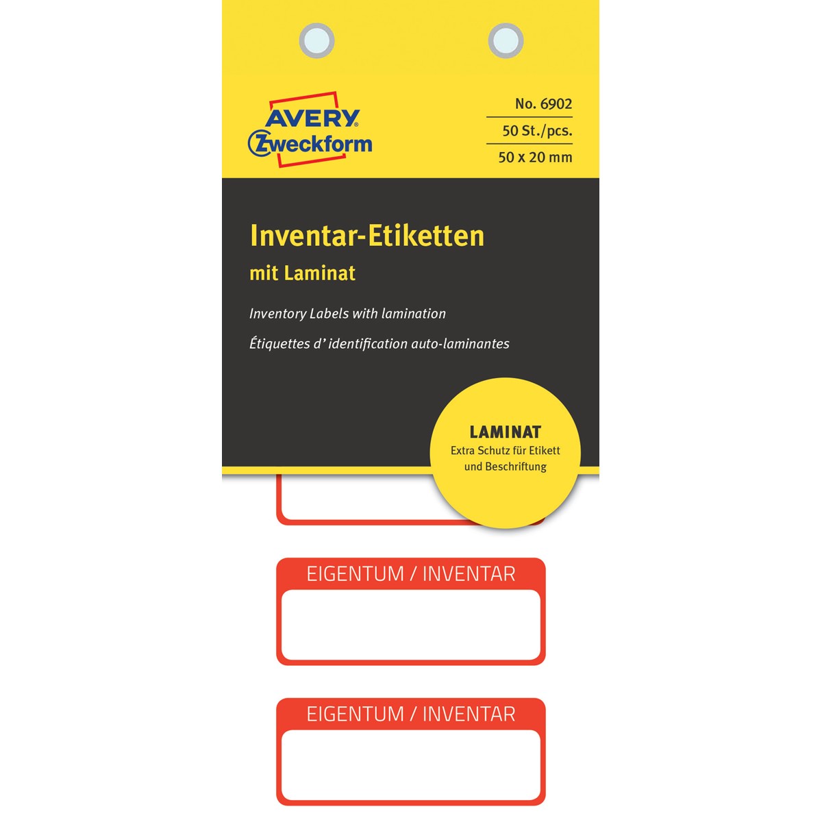 Die roten selbstklebenden Inventar-Etiketten 6902 im Format 50x20mm von AVERY ZWECKFORM schützen die Beschriftung besonders durch das anhängende, transparente Polyester-Laminat. 50 Inventaretiketten auf 10 Bogen im praktischen Spenderheft. Die Etiketten sind besonders strapazierfähig und können ganz einfach mittels Folienstift oder Kugelschreiber individuell vor Ort beschriftet werden. Durch das Laminat sind Etikett und Beschriftung besonders geschützt. Einfach Etikett beschriften, Trägerfolie vom Laminat abziehen und aufkleben. Die Etiketten sind ideal zur dauerhaften Kennzeichnung und Sicherung Ihres Inventars und Eigentum, z.B. bei hochindividueller Inventarisierung. Die Etiketten haften auf vielen verschiedenen Oberflächen und sind gegen Wasser, Öl, Reinigungs-, Desinfektions- und Lösemittel resistent und machen sie so ideal für stärkere Beanspruchung.