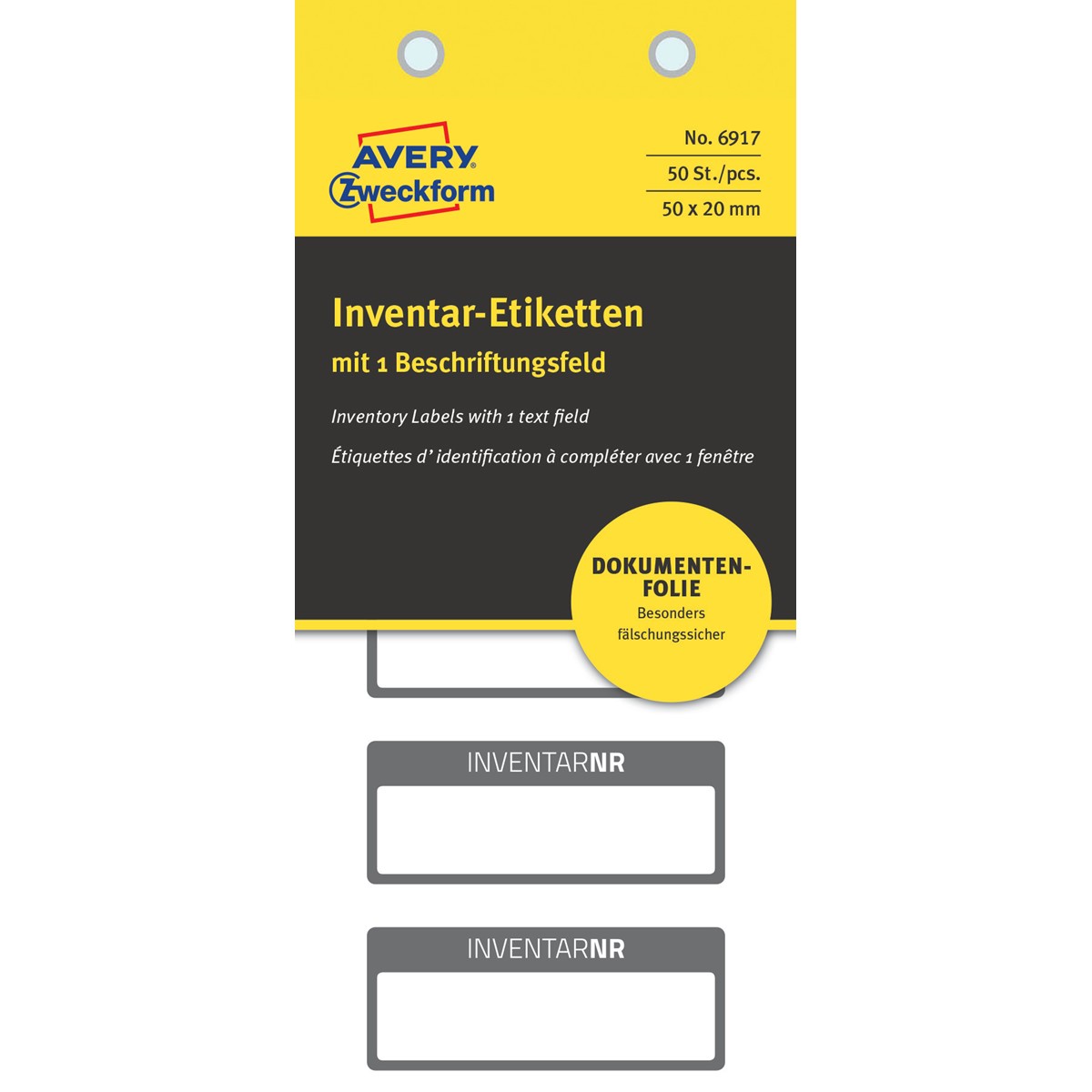 Die abziehsicheren Inventar-Etiketten 6917 im Format 50x20mm von AVERY ZWECKFORM sind besonders manipulationssicher. 50 Inventaretiketten mit 1 Beschriftungsfeld auf 10 Bogen im praktischen Spenderheft. Die Etiketten lassen sich nur noch in kleinen Einzelteilen abziehen, was eine Übertragung des Inventaretiketts unmöglich macht. Sie beugen damit Manipulation und Missbrauch aktiv vor. Der Aufdruck auf den Etiketten ist kratzbeständig und wetterfest und sie können ganz einfach mittels permanentem Folienstift individuell vor Ort beschriftet werden. Die Etiketten sind ideal zur Sicherheitskennzeichnung Ihres Inventars und Eigentum, wie z.B. Drucker, Kaffeemaschinen, Büromöbel etc. Die Inventaretiketten haften auf vielen verschiedenen Oberflächen und sind gegen Wasser, Öl, Reinigungs-, Desinfektions- und Lösemittel resistent.