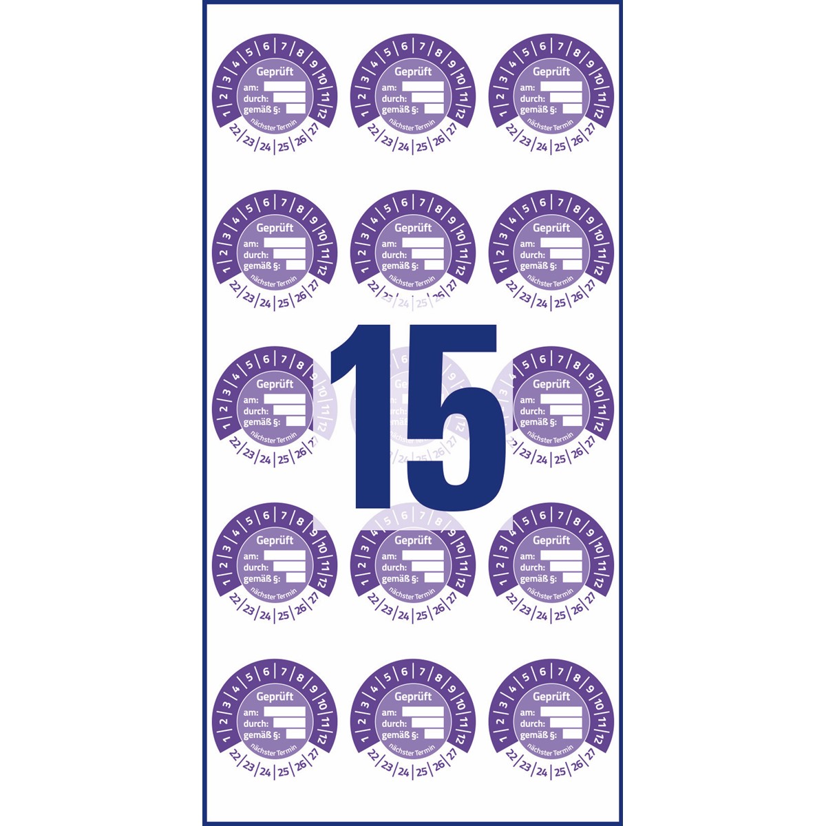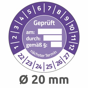 Die violetten Prüfplaketten 6959-2022 im runden, Ø20mm Format von AVERY ZWECKFORM sind besonders wetterfest und widerstandsfähig. 120 Prüfplaketten auf 8 Bogen im praktischen Spenderheft. Die Plaketten "Geprüft am / durch / gemäß § / nächster Termin" mit 12 Monaten und den Jahren 2022-2027 sind ideal zur individuellen Kennzeichnung Ihres Inventars und Eigentums. Der Aufdruck auf den Etiketten ist kratzbeständig und wetterfest und sie können ganz einfach mittels Folienstift individuell vor Ort beschriftet werden. Die Plaketten haften auf vielen verschiedenen Oberflächen und sind gegen Wasser, Öl, Reinigungs-, Desinfektions- und Lösemittel resistent.
