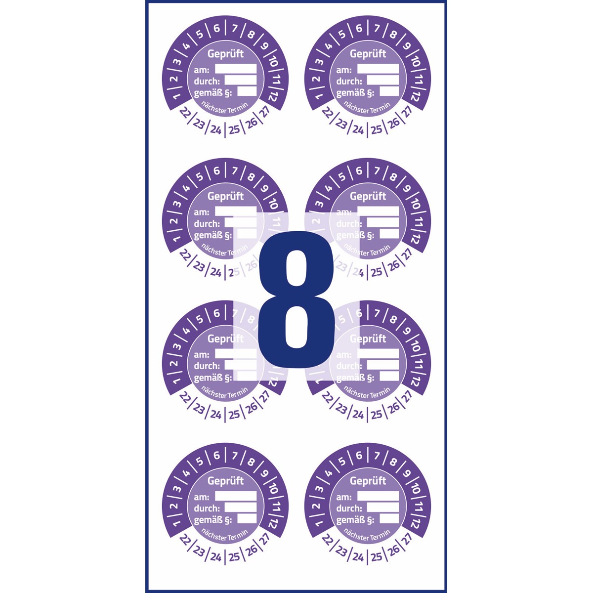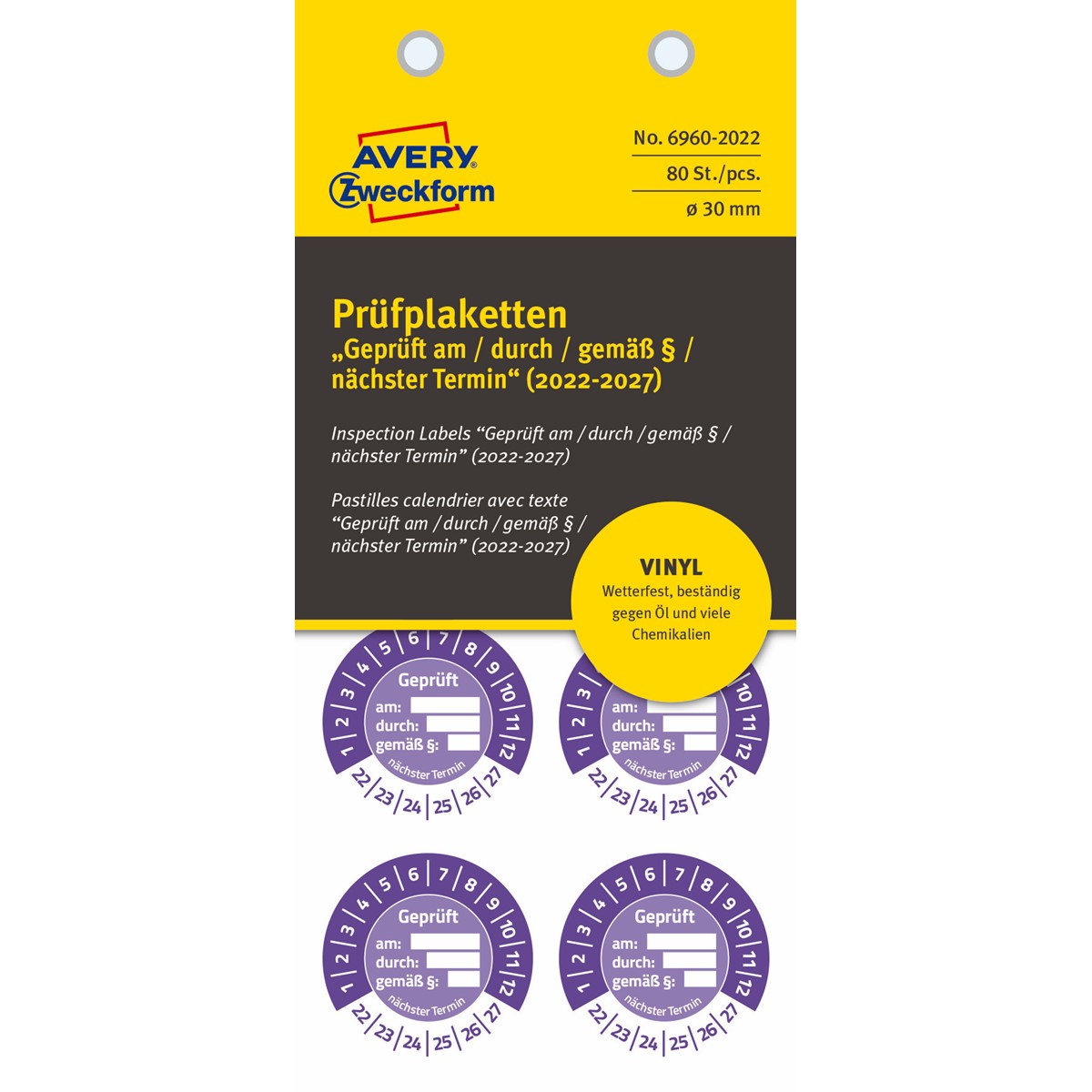 Die violetten Prüfplaketten 6960-2022 im runden, Ø30mm Format von AVERY ZWECKFORM sind besonders wetterfest und widerstandsfähig. 80 Prüfplaketten auf 10 Bogen im praktischen Spenderheft. Die Plaketten "Geprüft am / durch / gemäß § / nächster Termin" mit 12 Monaten und den Jahren 2022-2027 sind ideal zur individuellen Kennzeichnung Ihres Inventars und Eigentums. Der Aufdruck auf den Etiketten ist kratzbeständig und wetterfest und sie können ganz einfach mittels Folienstift individuell vor Ort beschriftet werden. Die Plaketten haften auf vielen verschiedenen Oberflächen und sind gegen Wasser, Öl, Reinigungs-, Desinfektions- und Lösemittel resistent.