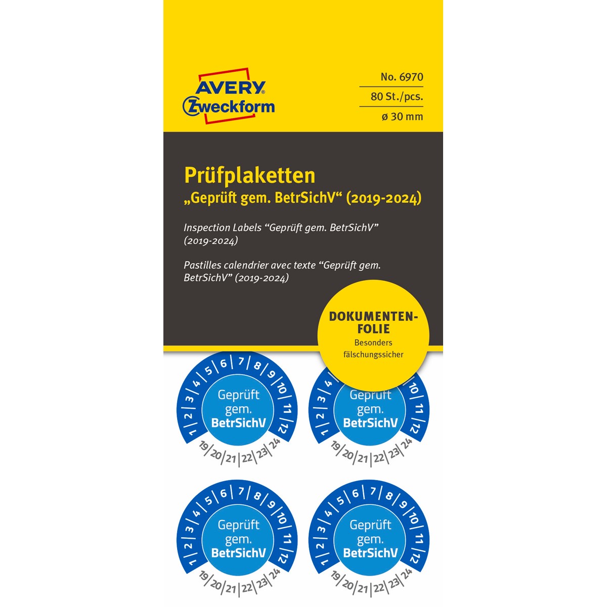 Die blauen Prüfplaketten 6970 im runden, Ø30mm Format von AVERY ZWECKFORM sind besonders abzieh- und manipulationssicher. 80 Prüfplaketten auf 10 Bogen im praktischen Spenderheft. Die Plaketten "Geprüft gem. BetrSichV" mit 12 Monaten und den Jahren 2019-2024 lassen sich nur in kleinen Einzelteilen abziehen, was eine Übertragung der Prüfplakette unmöglich macht. Sie beugen damit Manipulation und Missbrauch aktiv vor. Die Prüfplaketten sind ideal zur individuellen Kennzeichnung Ihres Inventars und Eigentum vor Ort und einfach mit Folienstift zu beschriften. Die Plaketten haften auf vielen verschiedenen Oberflächen und sind resistent gegen Wasser, Öl, Reinigungs-, Desinfektions- und Lösemittel.