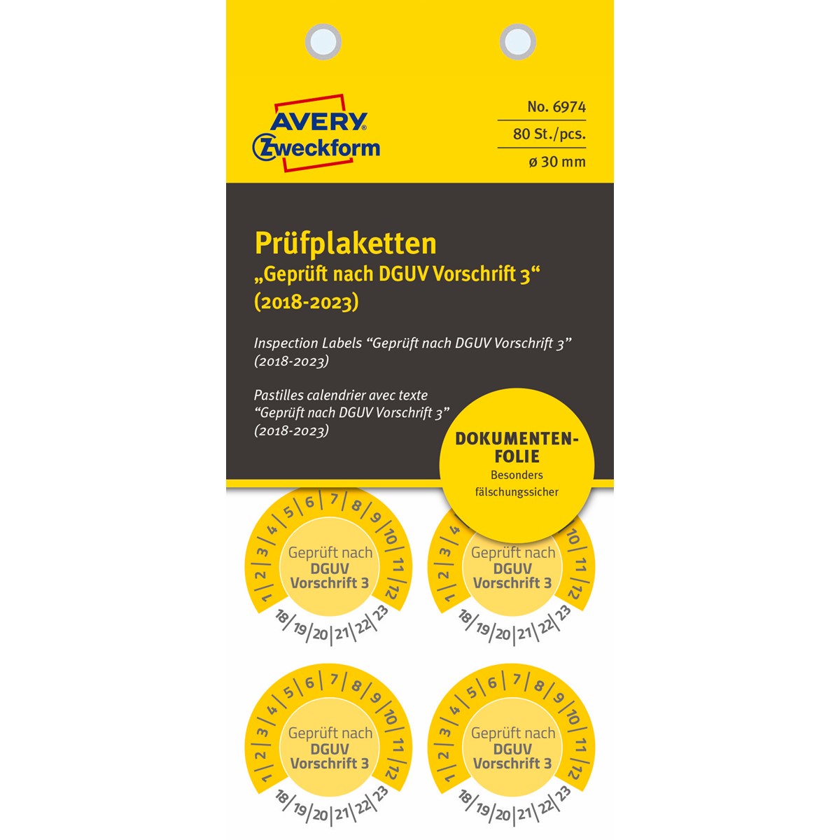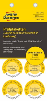 Die gelben Prüfplaketten 6974 im runden, Ø30mm Format von AVERY ZWECKFORM sind besonders abzieh- und manipulationssicher. 80 Prüfplaketten auf 10 Bogen im praktischen Spenderheft. Die Plaketten "Geprüft nach DGUV Vorschrift 3" mit 12 Monaten und den Jahren 2018-2023 lassen sich nur in kleinen Einzelteilen abziehen, was eine Übertragung der Prüfplakette unmöglich macht. Sie beugen damit Manipulation und Missbrauch aktiv vor. Die Prüfplaketten sind ideal zur individuellen Kennzeichnung Ihres Inventars und Eigentum vor Ort und einfach mit Folienstift zu beschriften. Die Plaketten haften auf vielen verschiedenen Oberflächen und sind resistent gegen Wasser, Öl, Reinigungs-, Desinfektions- und Lösemittel.