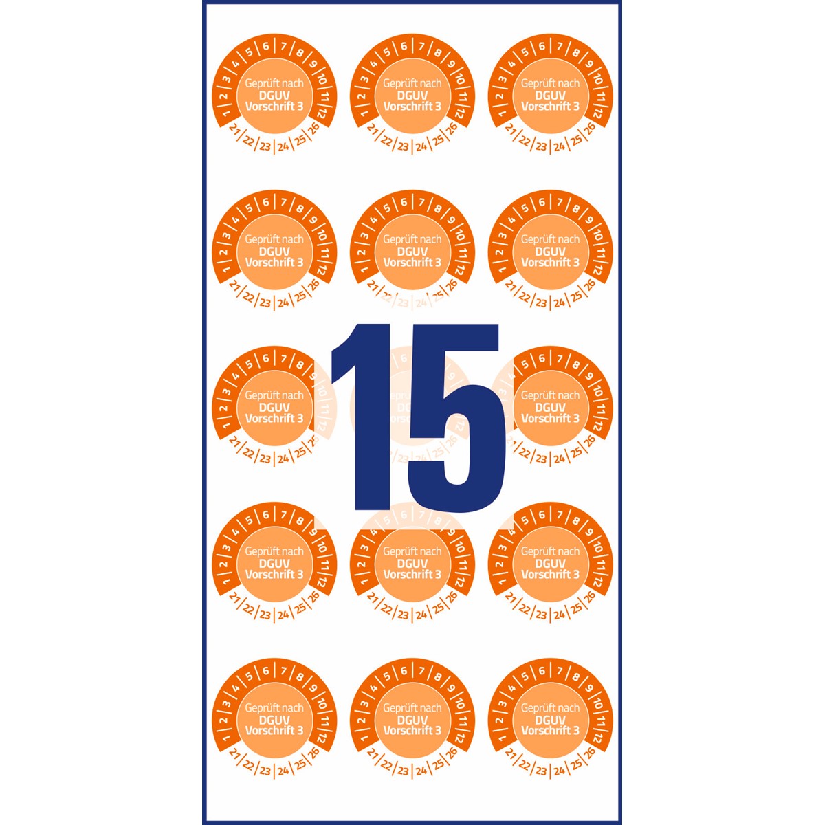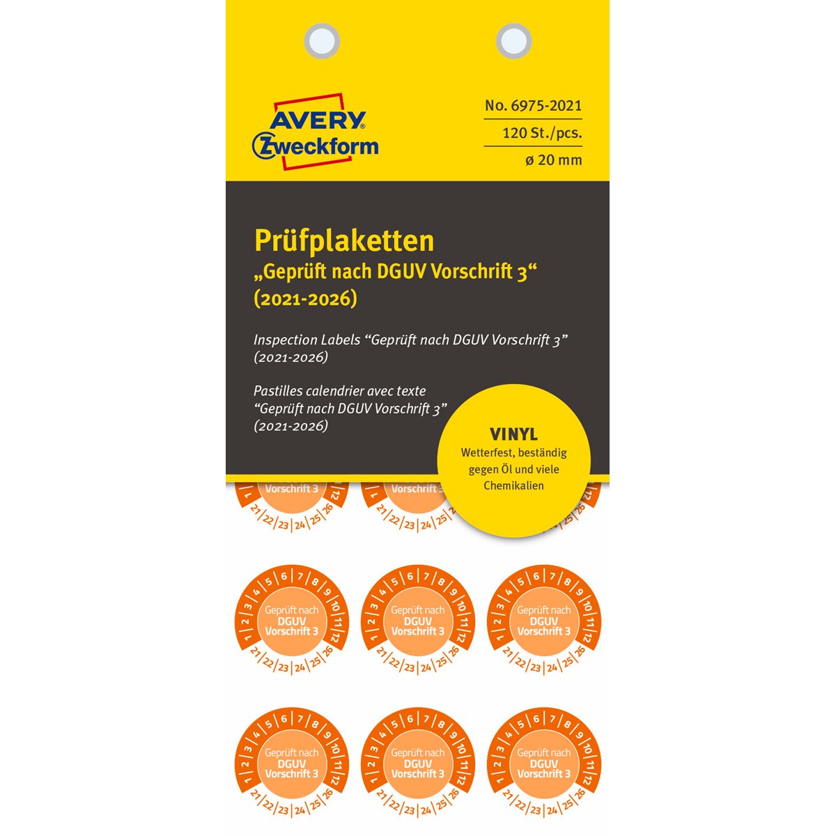 Die orangen Prüfplaketten 6975-2021 im runden, Ø20mm Format von AVERY ZWECKFORM sind besonders wetterfest und widerstandsfähig. 120 Prüfplaketten auf 8 Bogen im praktischen Spenderheft. Die Plaketten "Geprüft nach DGUV Vorschrift 3" mit 12 Monaten und den Jahren 2021-2026 sind ideal zur individuellen Kennzeichnung Ihres Inventars und Eigentum. Der Aufdruck auf den Etiketten ist kratzbeständig und wetterfest und sie können ganz einfach mittels Folienstift individuell vor Ort beschriftet werden. Die Plaketten haften auf vielen verschiedenen Oberflächen und sind gegen Wasser, Öl, Reinigungs-, Desinfektions- und Lösemittel resistent.