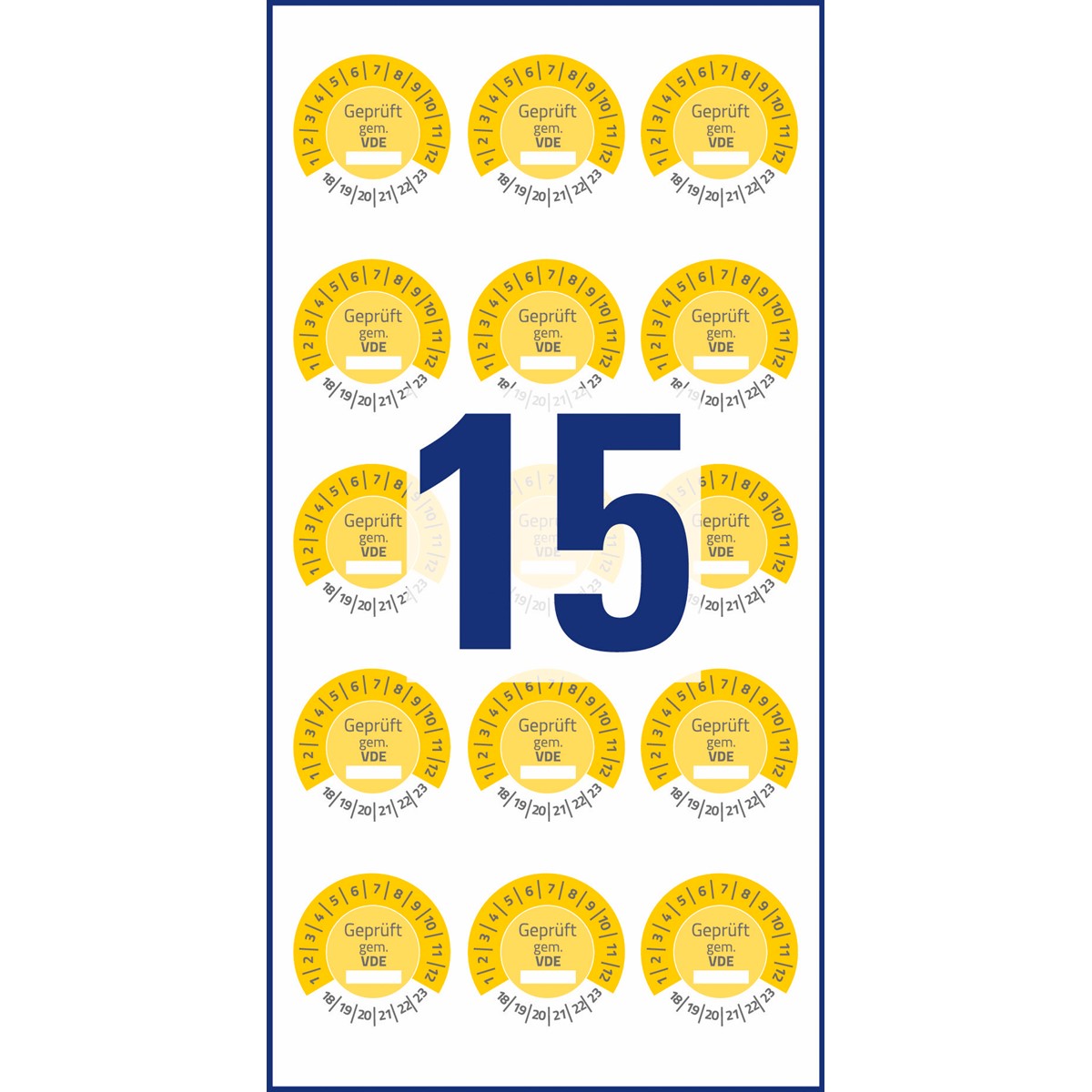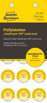 Die gelben Prüfplaketten 6981 im runden, Ø20mm Format von AVERY ZWECKFORM sind besonders abzieh- und manipulationssicher. 120 Prüfplaketten auf 8 Bogen im praktischen Spenderheft. Die Plaketten "Geprüft gem. VDE" mit 12 Monaten und den Jahren 2018-2023 lassen sich nur in kleinen Einzelteilen abziehen, was eine Übertragung der Prüfplakette unmöglich macht. Sie beugen damit Manipulation und Missbrauch aktiv vor. Die Prüfplaketten sind ideal zur individuellen Kennzeichnung Ihres Inventars und Eigentum vor Ort und einfach mit Folienstift zu beschriften. Die Plaketten haften auf vielen verschiedenen Oberflächen und sind resistent gegen Wasser, Öl, Reinigungs-, Desinfektions- und Lösemittel.