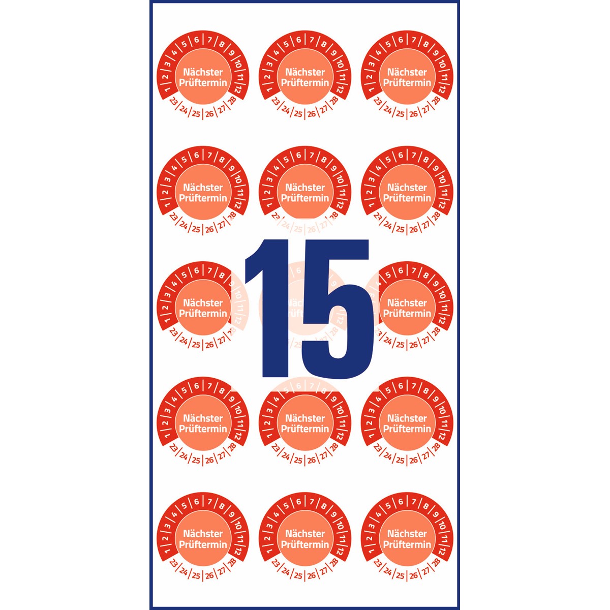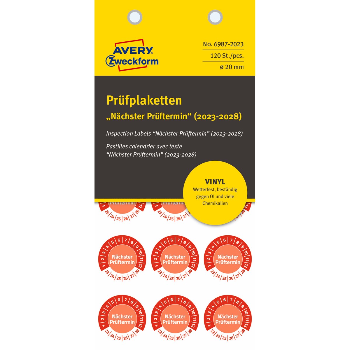 Die roten Prüfplaketten 6987-2023 im runden, Ø20mm Format von AVERY ZWECKFORM sind besonders wetterfest und widerstandsfähig. 120 Prüfplaketten auf 8 Bogen im praktischen Spenderheft. Die Plaketten "Nächster Prüftermin" mit 12 Monaten und den Jahren 2023-2028 sind ideal zur individuellen Kennzeichnung Ihres Inventars und Eigentums. Der Aufdruck auf den Etiketten ist kratzbeständig und wetterfest und sie können ganz einfach mittels Folienstift individuell vor Ort beschriftet werden. Die Plaketten haften auf vielen verschiedenen Oberflächen und sind gegen Wasser, Öl, Reinigungs-, Desinfektions- und Lösemittel resistent.