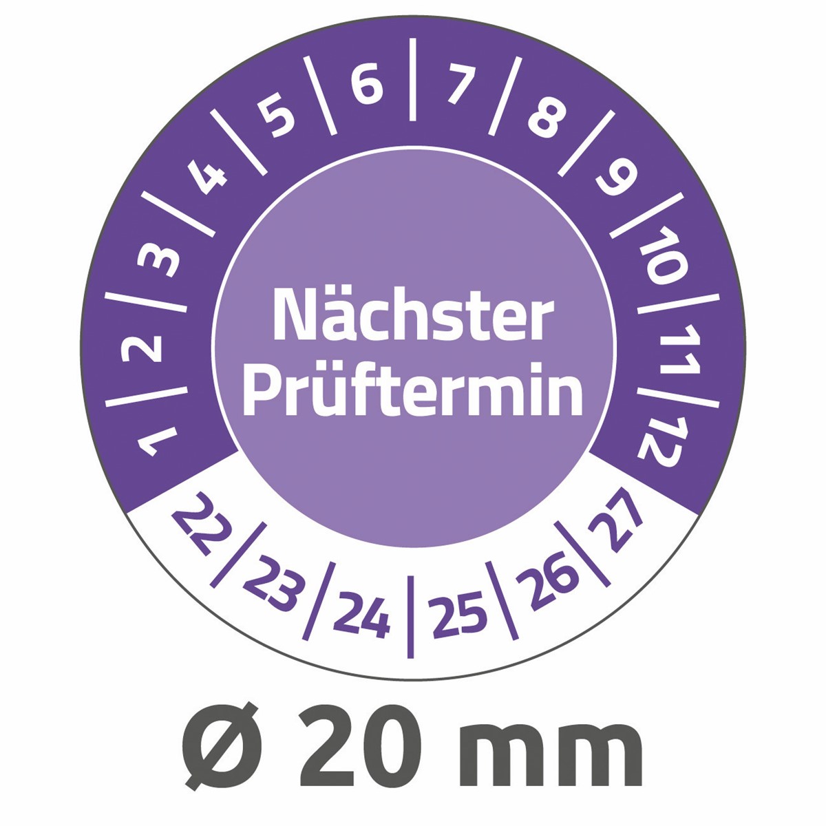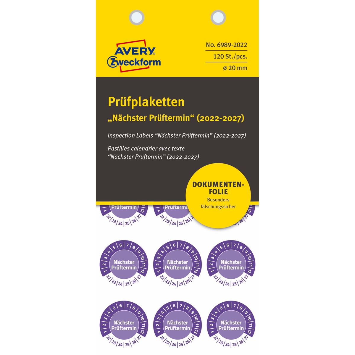 Die violetten Prüfplaketten 6989-2022 im runden, Ø20mm Format von AVERY ZWECKFORM sind besonders abzieh- und manipulationssicher. 120 Prüfplaketten auf 8 Bogen im praktischen Spenderheft. Die Plaketten "Nächster Prüftermin" mit 12 Monaten und den Jahren 2022-2027 lassen sich nur in kleinen Einzelteilen abziehen, was eine Übertragung der Prüfplakette unmöglich macht. Sie beugen damit Manipulation und Missbrauch aktiv vor. Die Prüfplaketten sind ideal zur individuellen Kennzeichnung Ihres Inventars und Eigentum vor Ort und einfach mit Folienstift zu beschriften. Die Plaketten haften auf vielen verschiedenen Oberflächen und sind resistent gegen Wasser, Öl, Reinigungs-, Desinfektions- und Lösemittel.
