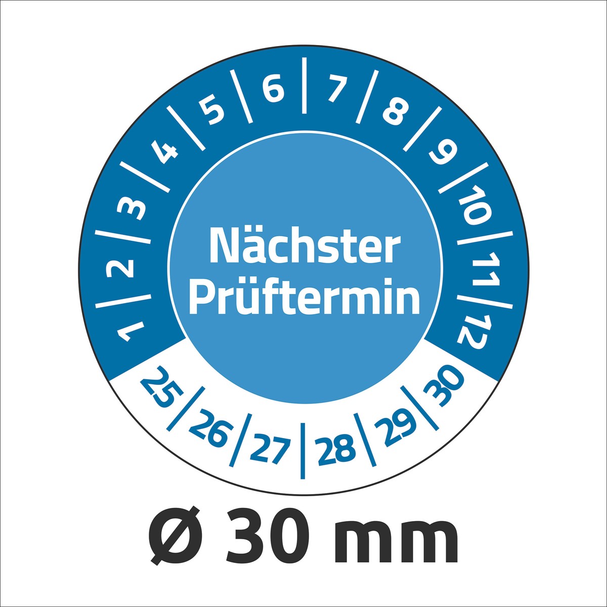 Die blauen Prüfplaketten 6990-2025 im runden, Ø 30 mm Format von AVERY ZWECKFORM sind besonders abzieh- und manipulationssicher.