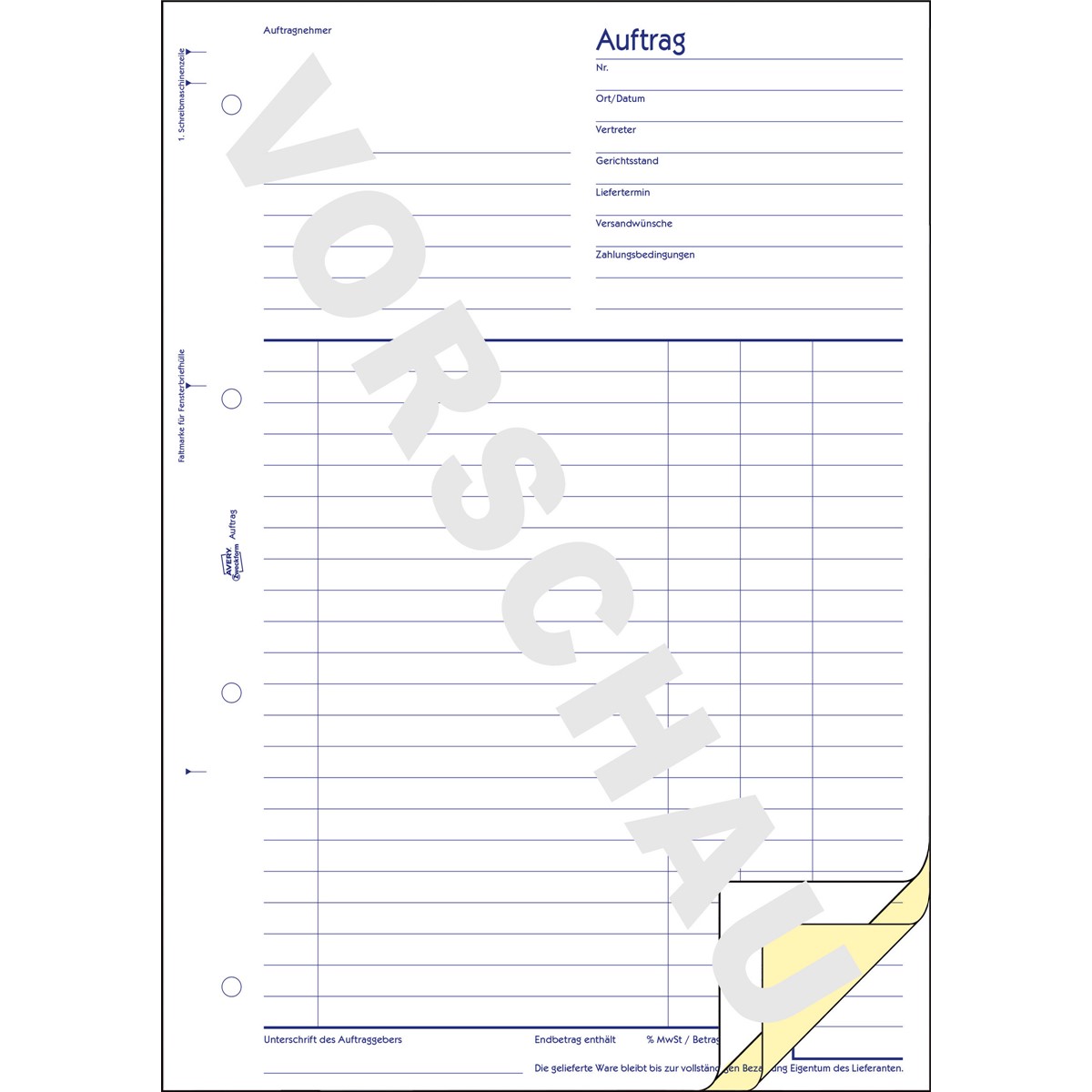 Der Auftrag 758 von AVERY ZWECKFORM im DIN A4 Buchformat bietet Ihnen die Möglichkeit, alle nötigen Angaben bei der Vergabe von Aufträgen abzudecken und auf das vorgedruckte Auftragsformular einzutragen. Das Auftragsformular beinhaltet 50 vorgedruckte weiße Aufträge mit jeweils 2 vorgedruckten Durchschlägen in gelb und weiß und 2 Blatt Blaupapier. Die insgesamt 50 Aufträge haben einen schreibmaschinengerechten Zeilenabstand und sind mit einer Unterschriftszeile für Auftraggeber versehen. Die Auftragsformulare, Bestellvorlagen und Rechnungsvordrucke von Avery Zweckform sind zuverlässige, bewährte Hilfen für Ihre Warenwirtschaft, Buchhaltung und Steuer und werden regelmäßig von Rechtsexperten geprüft.