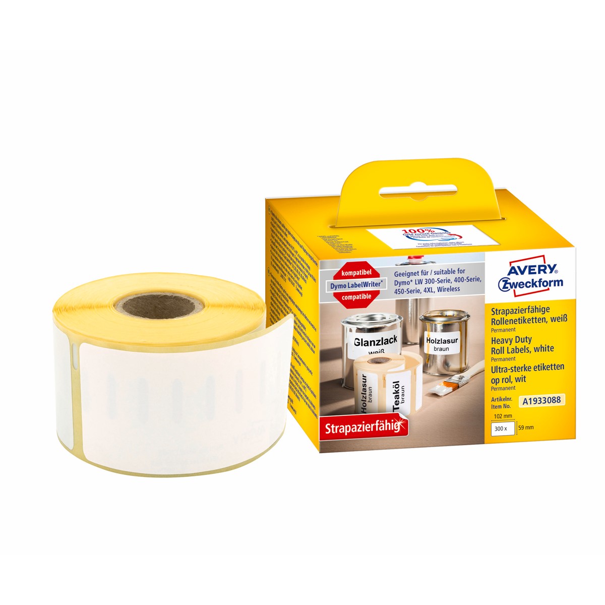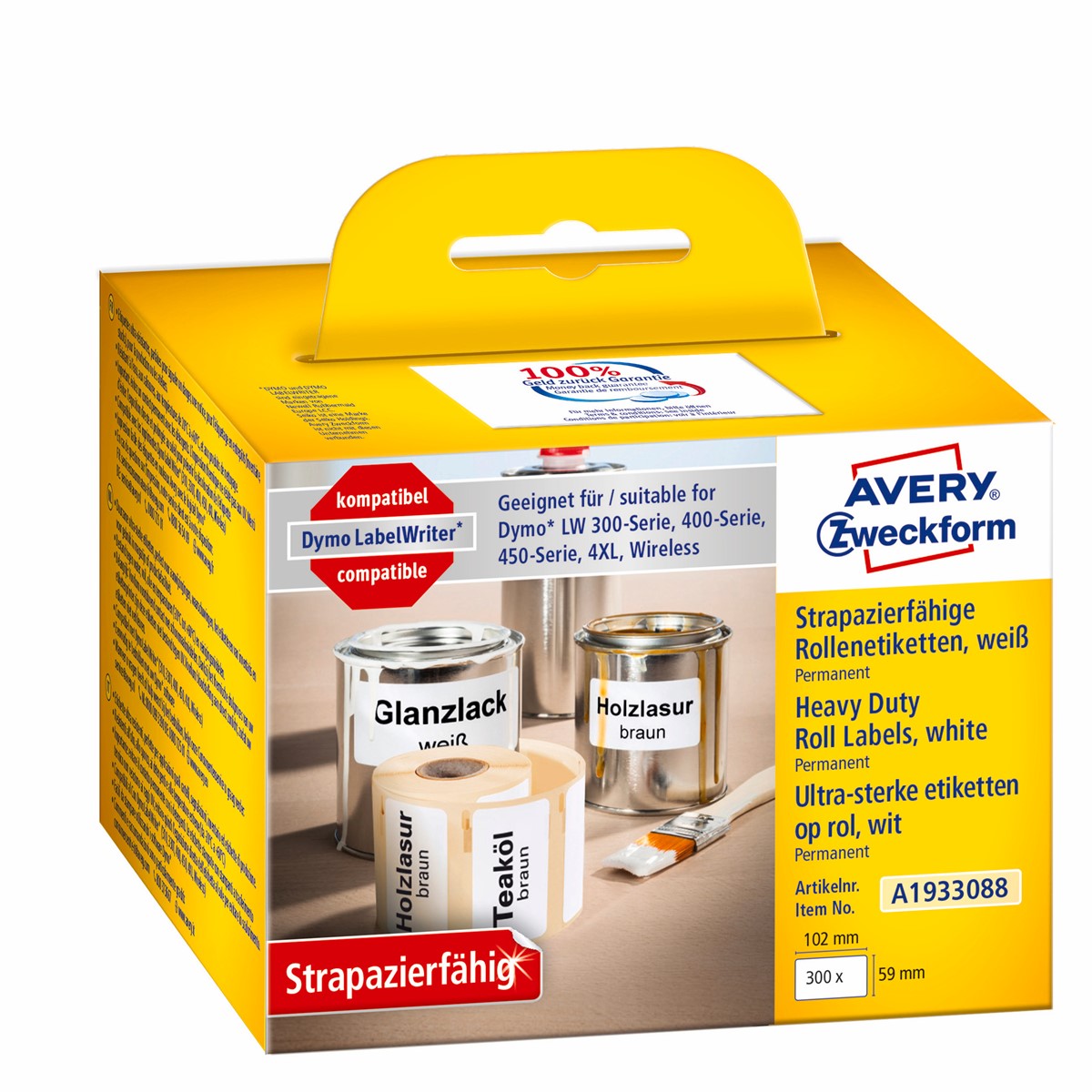 Die weißen, strapazierfähigen Etiketten auf Rolle A1933088 im Format 59 x 102 mm von Avery Zweckform sind kompatibel mit dem Dymo Labelwriter* (300er-, 400er-, 450er-Serie, 4XL, Wireless). Gestalten und Bedrucken Sie einzelne oder auch mehrere Etiketten schnell und einfach selbst mit Ihrer Dymo* Software. Die Aufkleber entsprechen dem Format Dymo* 1933088. Die Folien-Etiketten sind wasserfest, kratzfest, reißfest, schmutzresistent, öl- und temperaturbeständig (-20°C bis +60°C) sowie widerstandsfähig gegen Reinigungsmittel. Sie eignen sich so perfekt für anspruchsvolle Anwendungen in Haus & Garten, Garage, Werkstatt, Pausenraum u.v.m. Eine Packung enthält 300 Etiketten auf einer Rolle. *DYMO und DYMO LABELWRITER sind eingetragene Marken der Newell Rubbermaid Europe LLC. Avery Zweckform ist mit Newell Rubbermaid nicht verbunden.