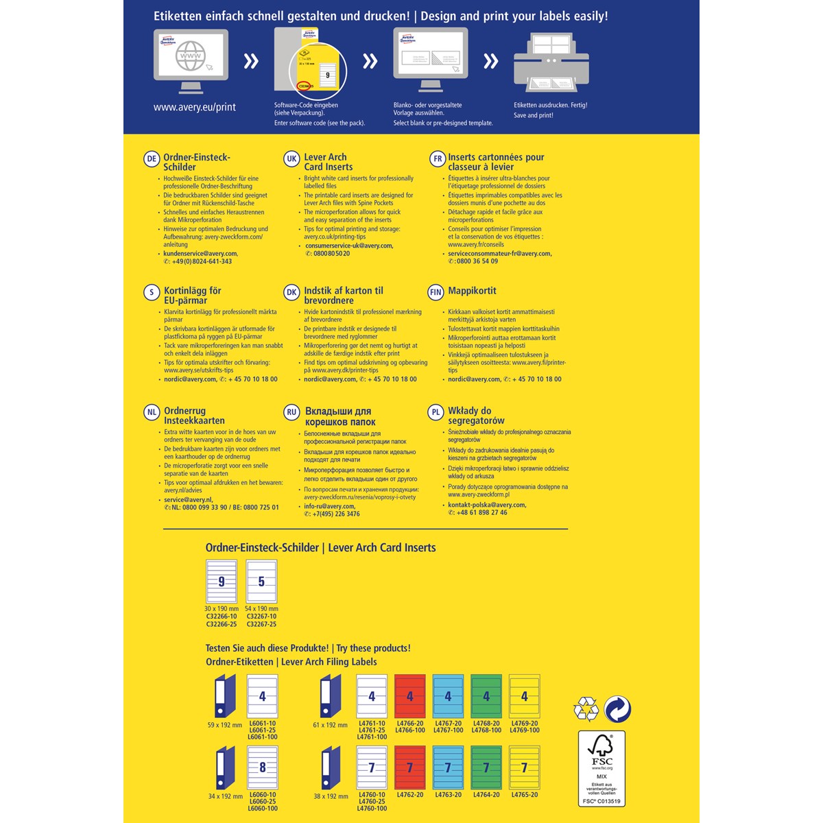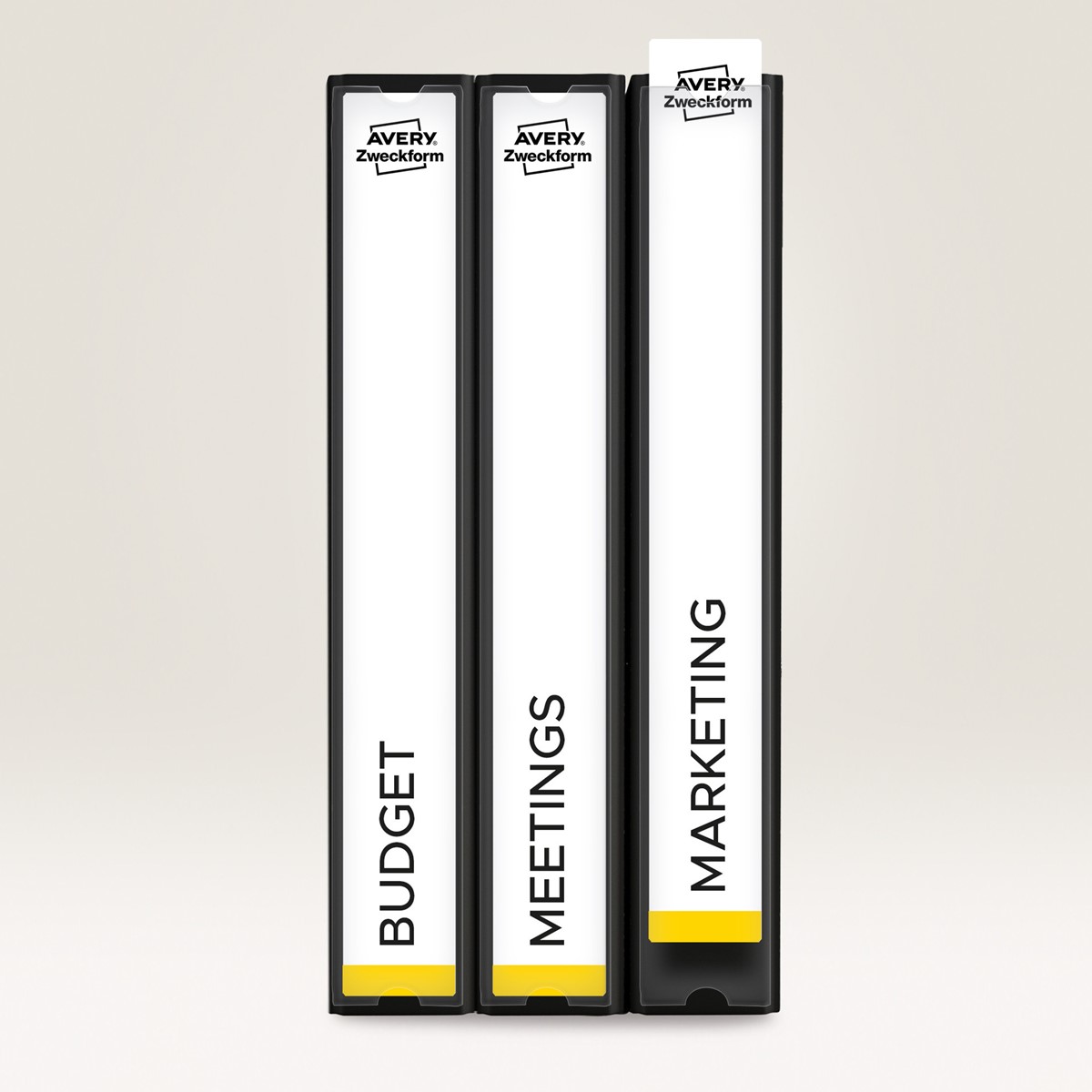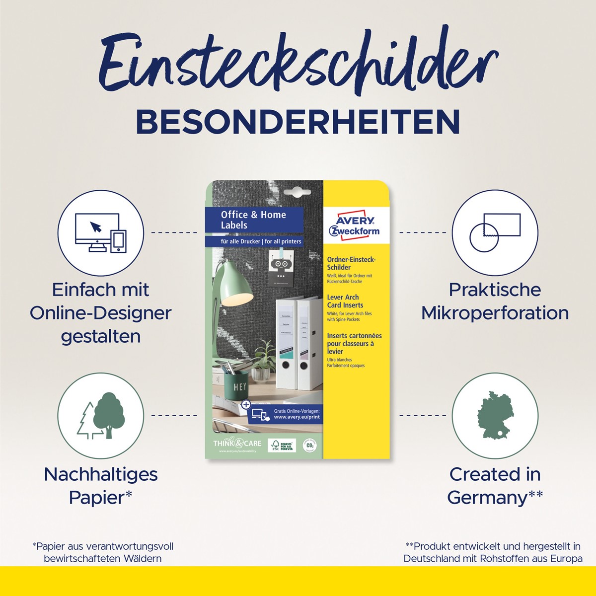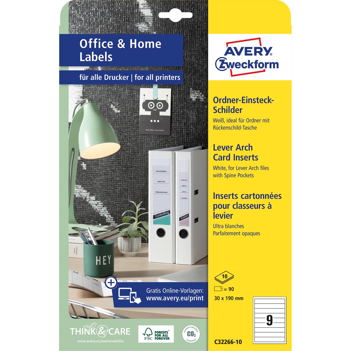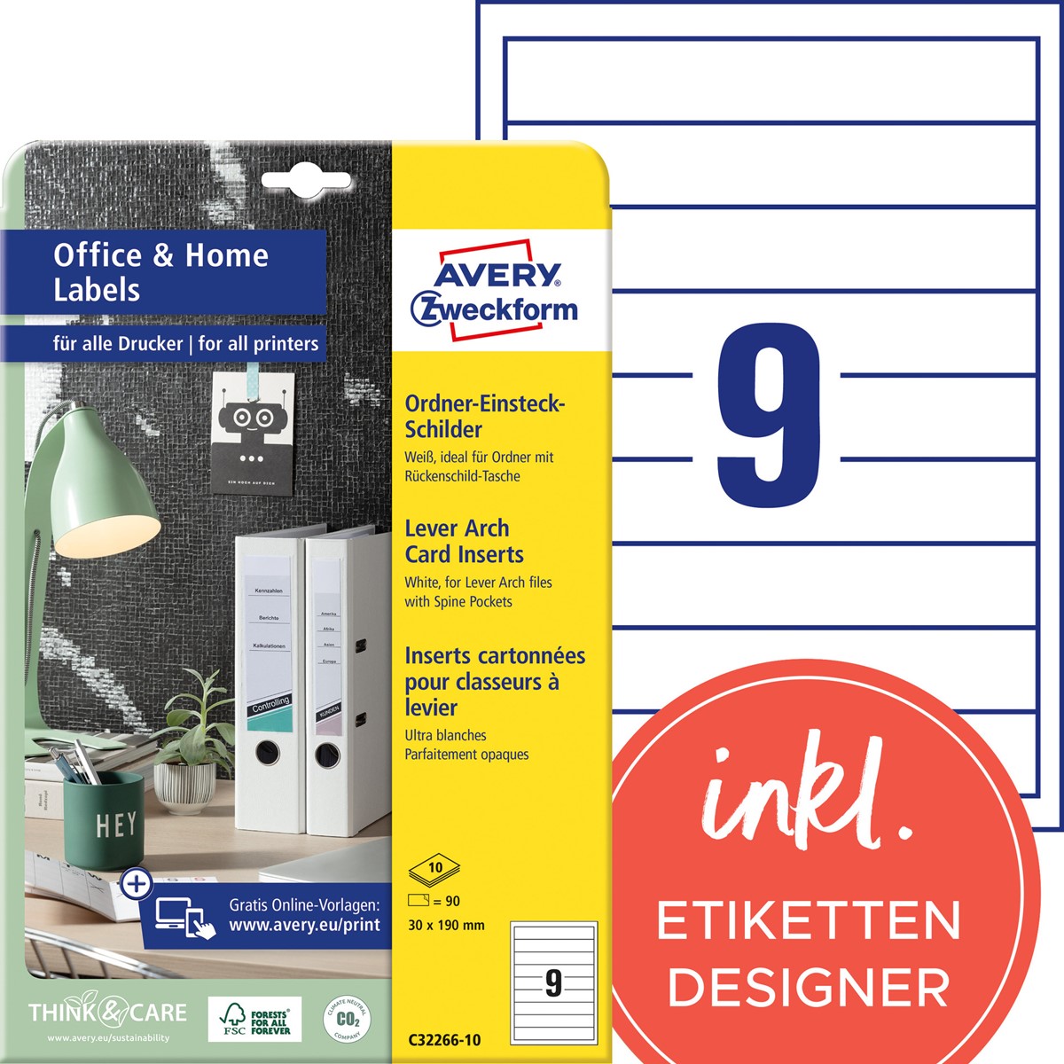 Qualität vom Etiketten-Experten: die weißen Ordner-Einsteckschilder C32266-10 im Format 30 x 190 mm von Avery Zweckform eignen sich für alle gängigen schmalen Standard-Ordner wie z.B. Leitz und Elba. Perfekt für die Ordnerbeschriftung im Home Office! 90 Rückenschilder auf 10 Bogen.