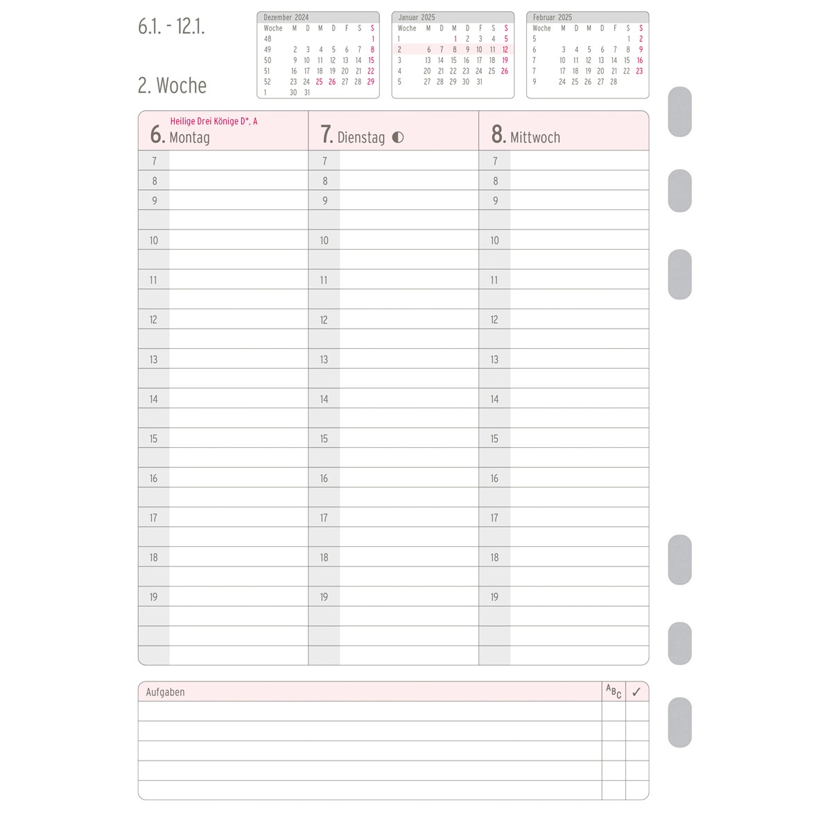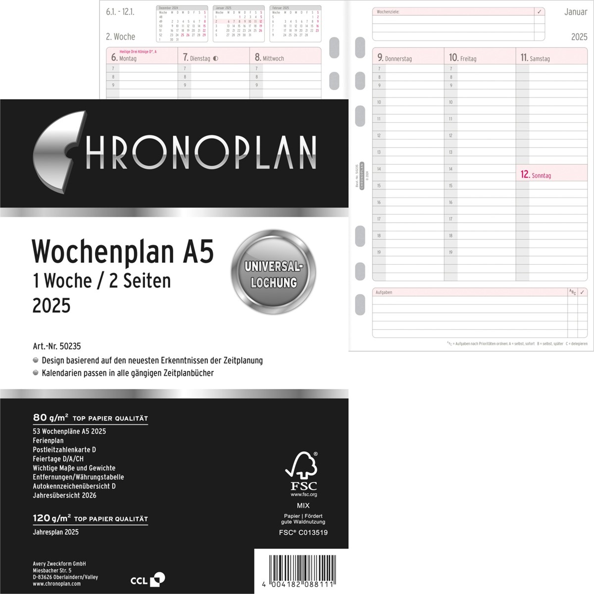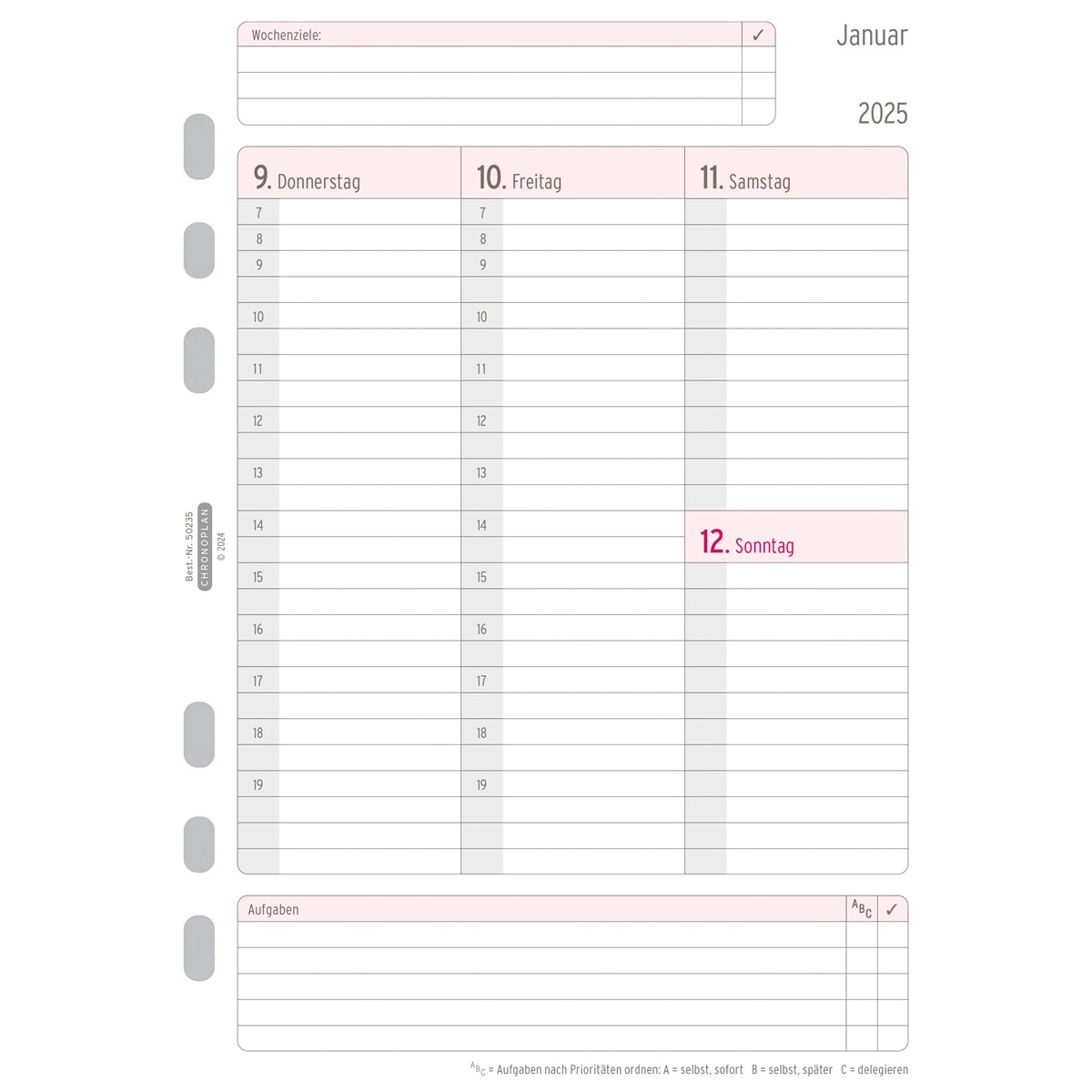 Mit dem CHRONOPLAN Wochenplan 2025 im A5 Format für Ihren Terminplaner behalten Sie die Übersicht über Ihre Termine und Aufgaben. Diese Kalendereinlage ermöglicht ein effizientes und übersichtliches Zeitmanagement mit einer Woche auf 2 Seiten. Die Tage sind nebeneinander in Spalten angeordnet, durch den Zweifarbdruck wird die Wochenplanung übersichtlicher. Zudem ermöglicht Ihnen der Chronoplan Wochenplan das Notieren von Wochenzielen, Priorisierung von Aufgaben und eine variable Zeiteinteilung bis 22 Uhr. Viele weitere Extras wie Jahresplan, Ferien- und Feiertagsübersicht, Postleitzahlenkarte u.v.m. machen den Chronoplan Terminplaner komplett. Dieser Wochenkalender passt dank Universallochung in alle gängigen Terminplaner wie z.B. Chronoplan, Time system, Filofax und viele mehr.