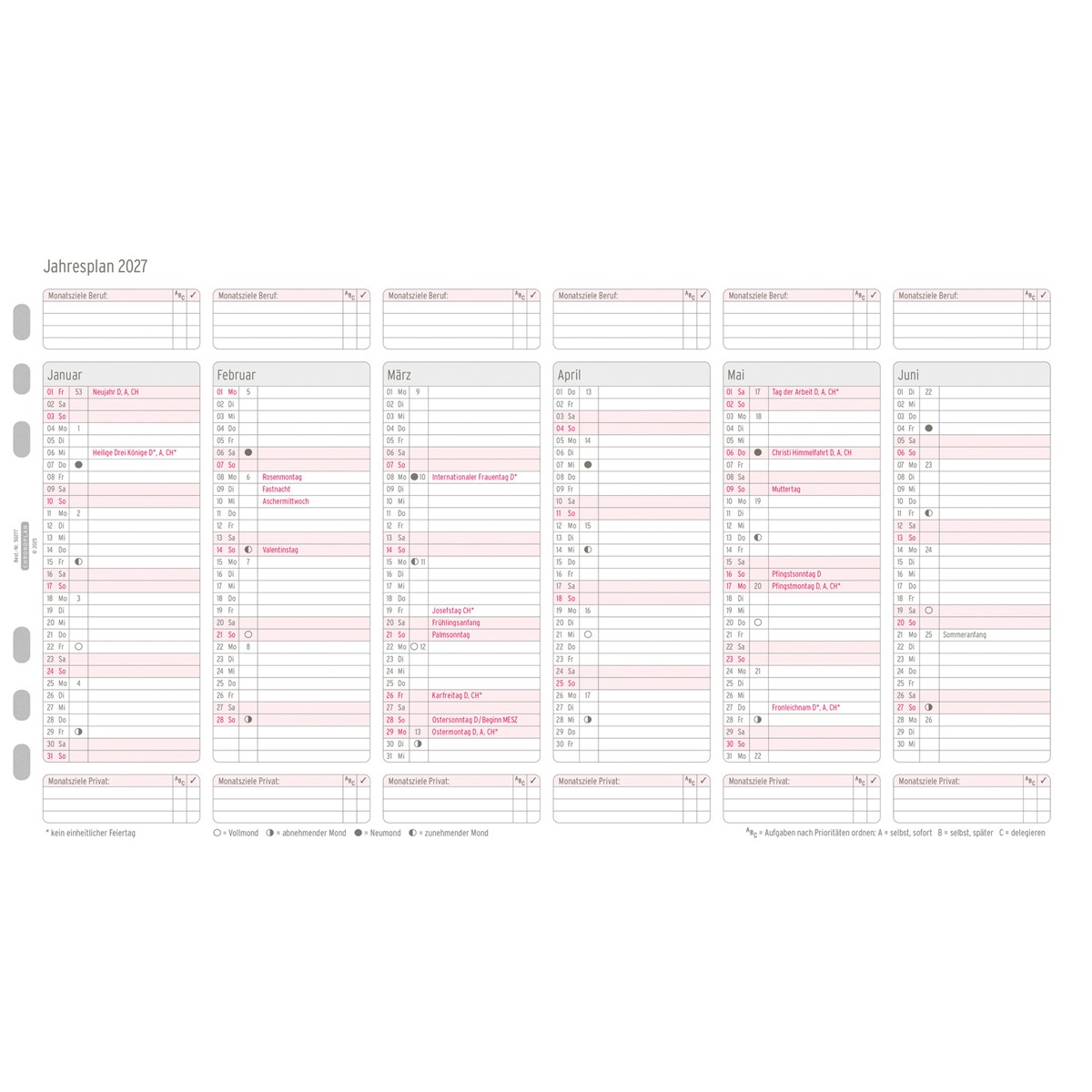 Mit dem ausklappbaren CHRONOPLAN Jahresplan 2027 im A5 Format für Ihren Terminplaner behalten Sie einen schnellen und praktischen Überblick über Ihre monatlichen Termine und Aufgaben. Diese Kalendereinlage hat eine Leporello Falzung und 2-Lochleisten für ein komfortables Planen rechts von der Mechanik. Der Kalender besteht aus einer extra starken Papierqualität von 120g/m, um ein Ausreißen zu verhindern.