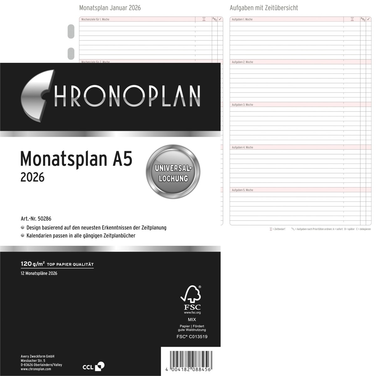 Mit dem ausklappbaren CHRONOPLAN Monatsplan 2026 im A5 Format für Ihren Terminplaner behalten Sie einen schnellen und praktischen Überblick über Ihre monatlichen Termine und Aufgaben. Durch die Monatskalender inklusive Uhrzeiteinteilung für die einzelnen Tage haben Sie alle Termine im Blick. Zudem haben Sie mit diesem Monatsplan auch die Möglichkeit Ihre beruflichen und privaten Monatsziele inklusive Priorisierung und Zeitbedarf zu planen und nachzuverfolgen.