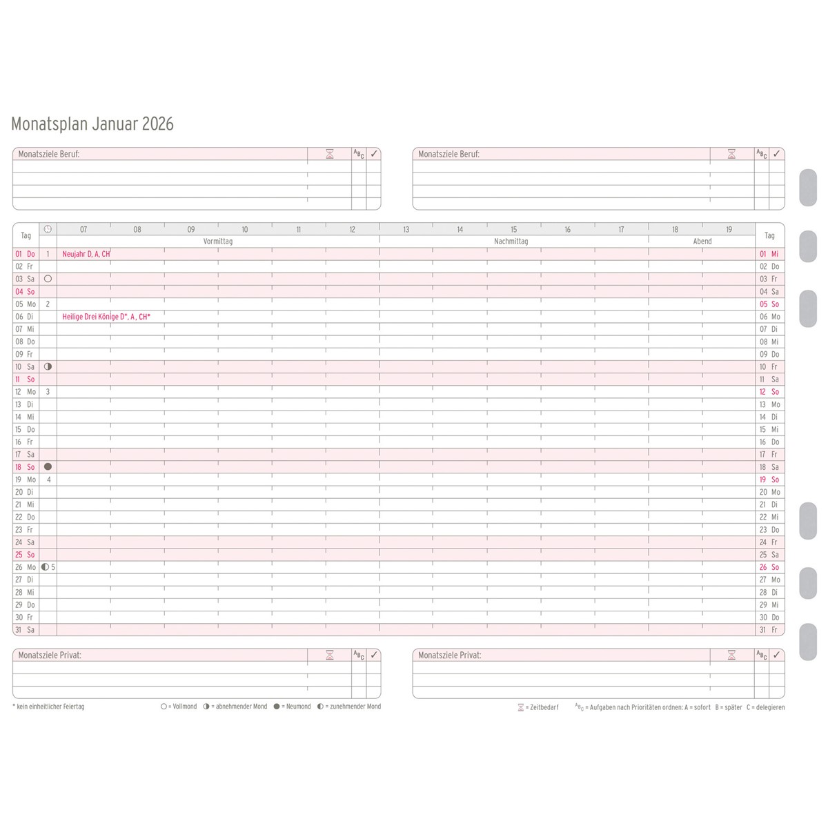 Dieser Monatskalender passt dank Universallochung in alle gängigen Terminplaner wie z.B. Chronoplan, Time system, Filofax und viele mehr.