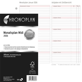 Mit dem ausklappbaren CHRONOPLAN Monatsplan 2026 im Midi Format für Ihren Terminplaner behalten Sie einen schnellen und praktischen Überblick über Ihre monatlichen Termine und Aufgaben. Durch die Monatskalender inklusive Uhrzeiteinteilung für die einzelnen Tage haben Sie alle Termine im Blick. Zudem haben Sie mit diesem Monatsplan auch die Möglichkeit Ihre beruflichen und privaten Monatsziele inklusive Priorisierung und Zeitbedarf zu planen und nachzuverfolgen.