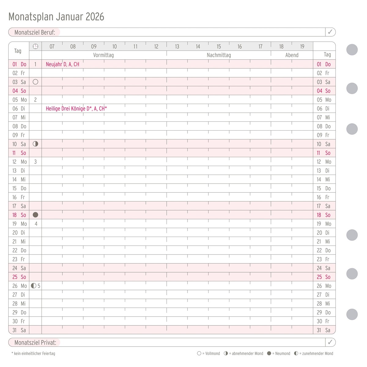 Dieser Monatskalender passt dank Universallochung in alle gängigen Terminplaner wie z.B. Chronoplan, Time system, Filofax und viele mehr.