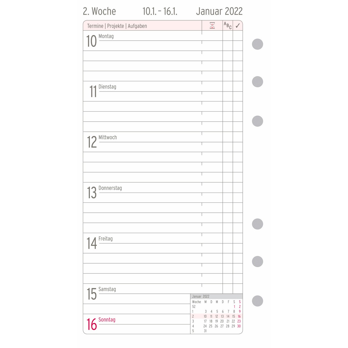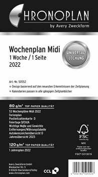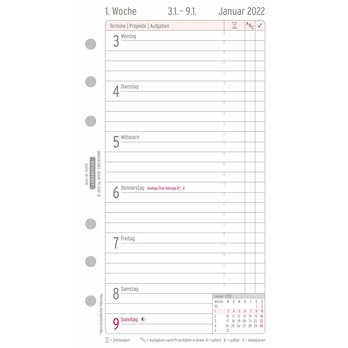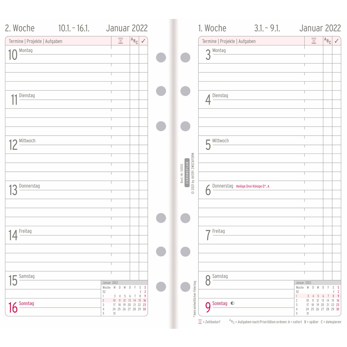 Mit dem CHRONOPLAN Wochenplan 2022 im Midi Format (96x172 mm) für Ihren Terminplaner behalten Sie die Übersicht über Ihre Termine und Aufgaben. Diese Kalendereinlage ermöglicht ein effizientes und übersichtliches Zeitmanagement mit einer Woche pro Seite. Die Tage sind untereinander in Zeilen angeordnet. Durch den Zweifarbdruck wird die Wochenplanung übersichtlicher. Zudem ermöglicht Ihnen der Chronoplan Wochenplan das Notieren von Wochenzielen und die Priorisierung von Aufgaben. Viele weitere Extras wie Jahresplan, Ferien- und Feiertagsübersicht, Postleitzahlenkarte u.v.m. machen den Chronoplan Terminplaner komplett. Dieser Wochenkalender passt dank Universallochung in alle gängigen Terminplaner wie z.B. Chronoplan, Time system, Filofax und viele mehr. CHRONOPLAN Zeitmanagement by Avery Zweckform.